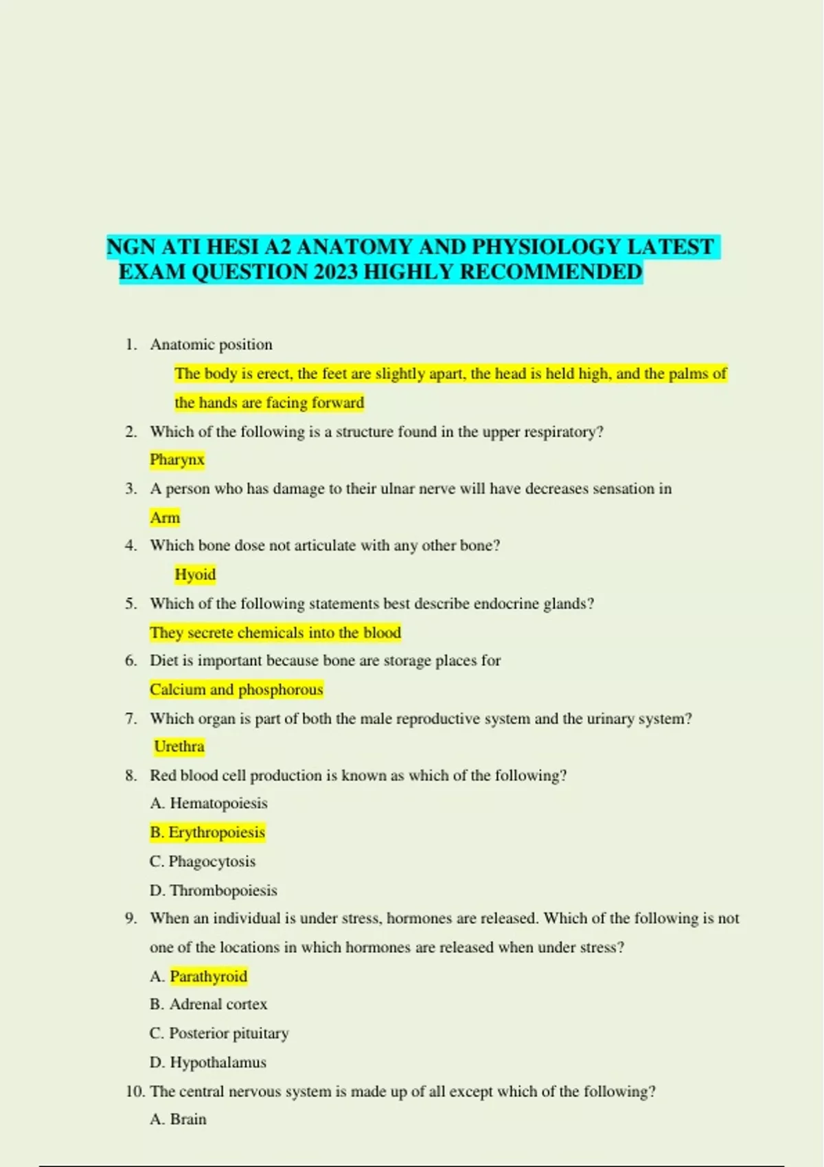 - NGN ATI HESI A2 ANATOMY AND PHYSIOLOGY
