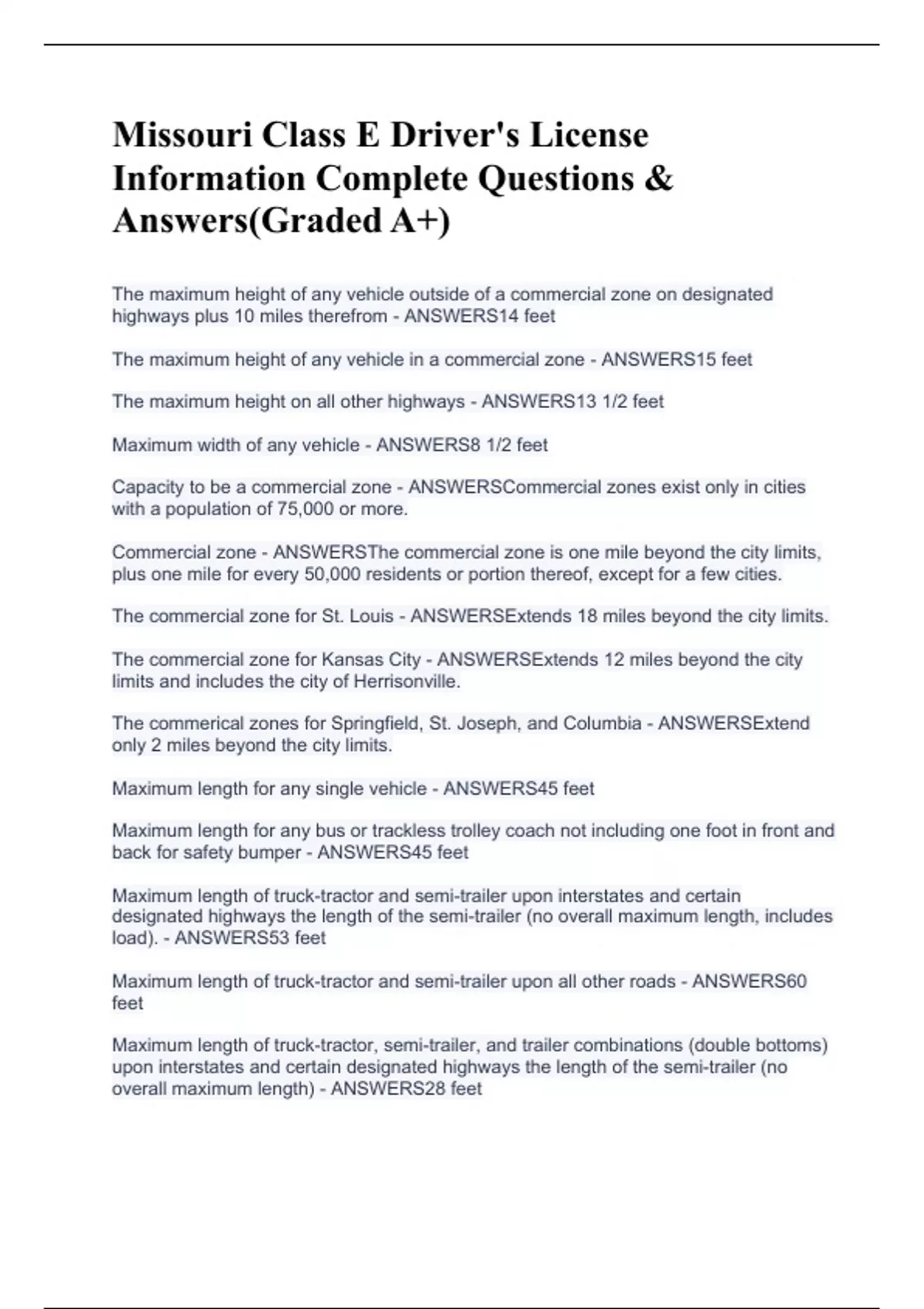 Missouri Class E Driver's License Information Complete Questions & Answers(Graded A+)