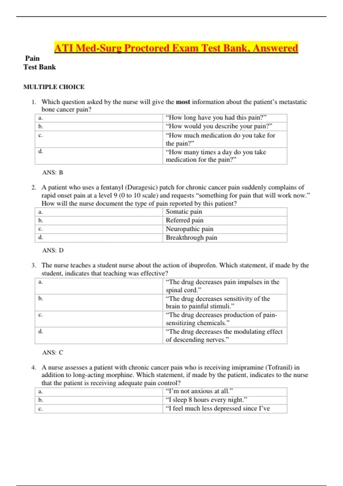 4. A nurse assesses a patient with chronic cancer pain who is receiving imipramine (Tofranil) in