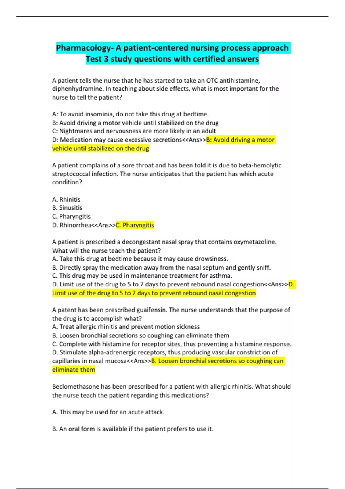 A patient tells the nurse that he has started to take an OTC antihistamine, diphenhydramine. In teaching about side effects, what is most important for the nurse to tell the patient? A: To avoid insominia, do not take this drug at bedtime. B: Avoid driving a motor vehicle until stabilized on the drug C: Nightmares and nervousness are more likely in an adult D: Medication may cause excessive secretions<<Ans>>B: Avoid driving a motor vehicle until stabilized on the drug A patient complains of a sore throat and has been told it is due to beta-hemolytic streptococcal infection. The nurse anticipates that the patient has which acute condition? A. Rhinitis B. Sinusitis C. Pharyngitis D. Rhinorrhea<<Ans>>C. Pharyngitis A patient is prescribed a decongestant nasal spray that contains oxymetazoline. What will the nurse teach the patient? A. Take this drug at bedtime because it may cause drowsiness. B. Directly spray the medication away from the nasal septum and gently sniff. C. This drug may be used in maintenance treatment for asthma. D. Limit use of the drug to 5 to 7 days to prevent rebound nasal congestion<<Ans>>D. Limit use of the drug to 5 to 7 days to prevent rebound nasal congestion A patent has been prescribed guaifensin. The nurse understands that the purpose of the drug is to accomplish what? A. Treat allergic rhinitis and prevent motion sickness B. Loosen bronchial secretions so coughing can eliminate them C. Complete with histamine for receptor sites, thus preventing a histamine response. D. Stimulate alpha-adrenergic receptors, thus producing vascular constriction of capillaries in nasal mucosa<<Ans>>B. Loosen bronchial secretions so coughing can eliminate them Beclomethasone has been prescribed for a patient with allergic rhinitis. What should the nurse teach the patient regarding this medications? A. This may be used for an acute attack. B. An oral form is available if the patient prefers to use it. C. Avoid large amounts of caffeine intake because an increased heart rate may occur. D. With continuous use, dryness of the nasal mucosa/lining may occur<<Ans>>D. With continuous use, dryness of the nasal mucosa/lining may occur The nurse is teaching a patient about diphenhydramine. Which instructions should the nurse include in the patient's teaching plan? (Select all that apply) A. Take medication on an empty stomach to facilitate absorption B. Avoid alcohol and other central nervous system depressants. C. Notify a health care provider if confusion or hypotension occurs D. Use sugarless candy, gum, or ice chips for temporary relief of dry mouth. E. Avoid handling dangerous equipment or performing dangerous activities until stabilized on the medication<<Ans>>B. Avoid alcohol and other central nervous system depressants. Fluticasone propionate and salmeterol combination inhalation is ordered for a patient with COPD. What does the nurse now about this medication? A. It can be used to treat an acute attack. B. It is delivered as a dry-powder inhaler. C. It contains a beta1 agonist and cromolyn. D. It is taken as a one puff two times a day. E. It promotes bronchodilation.<<Ans>>B. It is delivered as a dry-powder inhaler. D. It is taken as a one puff two times a day. E. It promotes bronchodilation. A patient with COPD has an acute bronchospasm. The nurse anticipates that the health care provider will prescribe which medications. A. Zafirlukast B. Epinephrine C. Dexamethasone D. Beclomethasone<<Ans>>B. Epinephrine A patient is prescribed aminophylline-theophylline. For what adverse effect should the nurse monitor the patient? A. Drowsiness B. Hypoglycemia C. Increased heart rate D. Decreased white blood cell count<<Ans>>C. Increased heart rate
