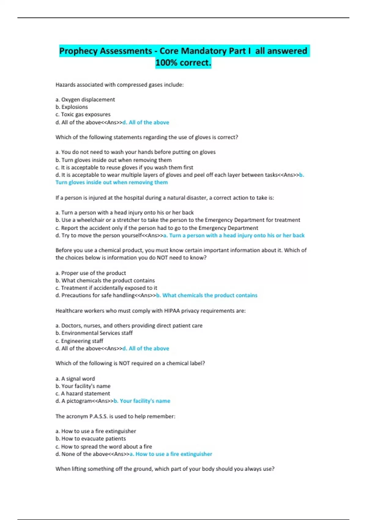 Hazards associated with compressed gases include: a. Oxygen displacement b. Explosions c. Toxic gas exposures d. All of the above<<Ans>>d. All of the above Which of the following statements regarding the use of gloves is correct? a. You do not need to wash your hands before putting on gloves b. Turn gloves inside out when removing them c. It is acceptable to reuse gloves if you wash them first d. It is acceptable to wear multiple layers of gloves and peel off each layer between tasks<<Ans>>b. Turn gloves inside out when removing them If a person is injured at the hospital during a natural disaster, a correct action to take is: a. Turn a person with a head injury onto his or her back b. Use a wheelchair or a stretcher to take the person to the Emergency Department for treatment c. Report the accident only if the person had to go to the Emergency Department d. Try to move the person yourself<<Ans>>a. Turn a person with a head injury onto his or her back Before you use a chemical product, you must know certain important information about it. Which of the choices below is information you do NOT need to know? a. Proper use of the product b. What chemicals the product contains c. Treatment if accidentally exposed to it d. Precautions for safe handling<<Ans>>b. What chemicals the product contains Healthcare workers who must comply with HIPAA privacy requirements are: a. Doctors, nurses, and others providing direct patient care b. Environmental Services staff c. Engineering staff d. All of the above<<Ans>>d. All of the above Which of the following is NOT required on a chemical label? a. A signal word b. Your facility's name c. A hazard statement d. A pictogram<<Ans>>b. Your facility's name The acronym P.A.S.S. is used to help remember: a. How to use a fire extinguisher b. How to evacuate patients c. How to spread the word about a fire d. None of the above<<Ans>>a. How to use a fire extinguisher When lifting something off the ground, which part of your body should you always use? a. Back b. Abdominals c. Arms d. Legs<<Ans>>d. Legs Which of the following statements regarding electrical safety is correct? a. Do not roll equipment over electrical cords because it can damage the cord b. It is acceptable to use a plug with a loose or broken pin as long as the device works c. Adaptors that convert three-pin plugs to two-pin plugs are safe to use d. Equipment should be unplugged by pulling the cord, not the plug<<Ans>>a. Do not roll equipment over electrical cords because it can damage the cord Placing a patient on Contact Precautions means that everyone must: a. Wear appropriate Personal Protective Equipment (PPE) such as gowns and gloves b. Wear a respirator c. Care for the patient in an airborne infection isolation room (AIIR) d. All of the above<<Ans>>a. Wear appropriate Personal Protective Equipment (PPE) such as gowns and gloves When mobilizing a weak or unsteady patient, which technique(s) should you consider? a. Using a transfer belt (gait belt) b. Using a mechanical lift, roller board, sliding board, flexible patient mover, or sling c. Having an assistant help you d. All of the above<<Ans>>d. All of the above Which of the following would be considered an internal disaster rather than an external one? a. Earthquake b. Hurricane c. Flood d. Bomb threat<<Ans>>d. Bomb threat In the event of an earthquake, which of the following should never be done? a. Moving all patients to a central area b. Closing all curtains and shades in the central area c. Closing all doors to the central area d. Using candles for illumination<<Ans>>d. Using candles for illumination When working with or near radiation, which of the following statements is incorrect? a. If you cannot locate your badge monitor, you should borrow one from your co-worker b. A 0.5-mm thick lead apron reduces scattered radiation by approximately 10 times c. Doubling the distance between a person and the radiation source reduces the radiation exposure by a factor of 4 d. Before you attempt a procedure, think ahead how you will accomplish it<<Ans>>a. If you cannot locate your badge monitor, you should borrow one from your co-worker When moving a patient from bed to wheelchair, which technique should you avoid at all times? a. Bending at your knees to lower the patient to the chair b. Having the patient hold onto your neck or shoulders c. Placing yourself in front of the patient and blocking the patient's leg closest to the chair with your foot and leg d. Positioning the wheelchair at a slight angle close to the bed<<Ans>>b. Having the patient hold onto your neck or shoulders