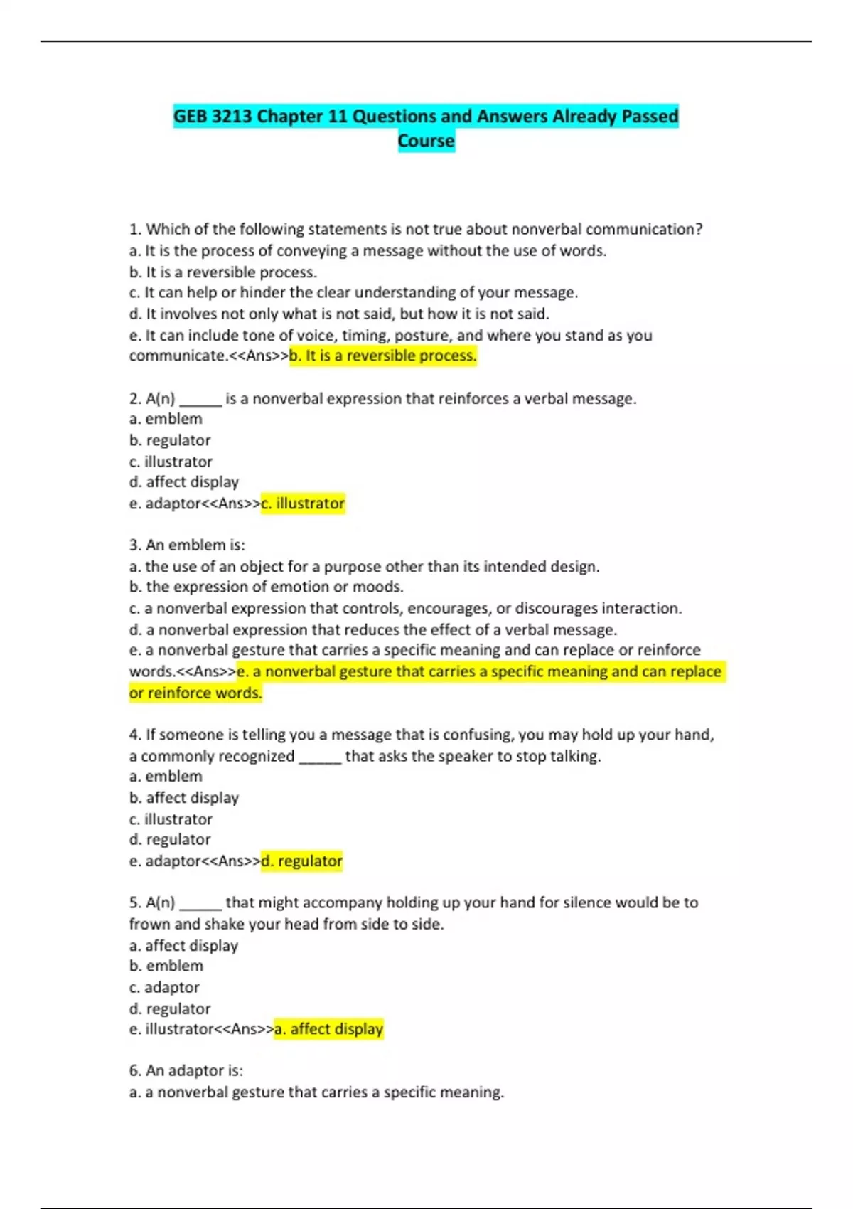1. Which of the following statements is not true about nonverbal communication? a. It is the process of conveying a message without the use of words. b. It is a reversible process. c. It can help or hinder the clear understanding of your message. d. It involves not only what is not said, but how it is not said. e. It can include tone of voice, timing, posture, and where you stand as you communicate.<<Ans>>b. It is a reversible process. 2. A(n) _____ is a nonverbal expression that reinforces a verbal message. a. emblem b. regulator c. illustrator d. affect display e. adaptor<<Ans>>c. illustrator 3. An emblem is: a. the use of an object for a purpose other than its intended design. b. the expression of emotion or moods. c. a nonverbal expression that controls, encourages, or discourages interaction. d. a nonverbal expression that reduces the effect of a verbal message. e. a nonverbal gesture that carries a specific meaning and can replace or reinforce words.<<Ans>>e. a nonverbal gesture that carries a specific meaning and can replace or reinforce words. 4. If someone is telling you a message that is confusing, you may hold up your hand, a commonly recognized _____ that asks the speaker to stop talking. a. emblem b. affect display c. illustrator d. regulator e. adaptor<<Ans>>d. regulator 5. A(n) _____ that might accompany holding up your hand for silence would be to frown and shake your head from side to side. a. affect display b. emblem c. adaptor d. regulator e. illustrator<<Ans>>a. affect display 6. An adaptor is: a. a nonverbal gesture that carries a specific meaning. b. something that reinforces a verbal message. c. something that helps us feel comfortable or indicates emotions or moods. d. a nonverbal expression that controls, encourages, or discourages interaction. e. a nonverbal expression that reinforces a verbal message.<<Ans>>c. something that helps us feel comfortable or indicates emotions or moods. 7. A(n) _____ involves adapting something about yourself in way for which it was not designed or for no apparent purpose. a. illustrator b. self-adaptor c. object-adaptor d. regulator e. affect display<<Ans>>b. self-adaptor 8. A(n) _____ involves the use of an object in a way for which it was not designed. a. illustrator b. self-adaptor c. object-adaptor d. regulator e. affect display<<Ans>>c. object-adaptor 9. _____ involves the substitution of appropriate nonverbal communication for nonverbal communication you may want to display. a. Signaling b. Replacing c. Complementing d. Masking e. Affect display<<Ans>>d. Masking 10. Which of the following about nonverbal communication is false? a. It is universal. b. It is confusing and contextual. c. It can be intentional or unintentional. d. It communicates feelings and attitudes. e. It cannot add to or replace verbal communication.<<Ans>>e. It cannot add to or replace verbal communication. 11. According to Albert Mehrabian, in terms of verbal and nonverbal messages, 55 percent is associated with _____. a. facial gestures b. tone of voice c. words d. listening skills e. intonation<<Ans>>a. facial gestures