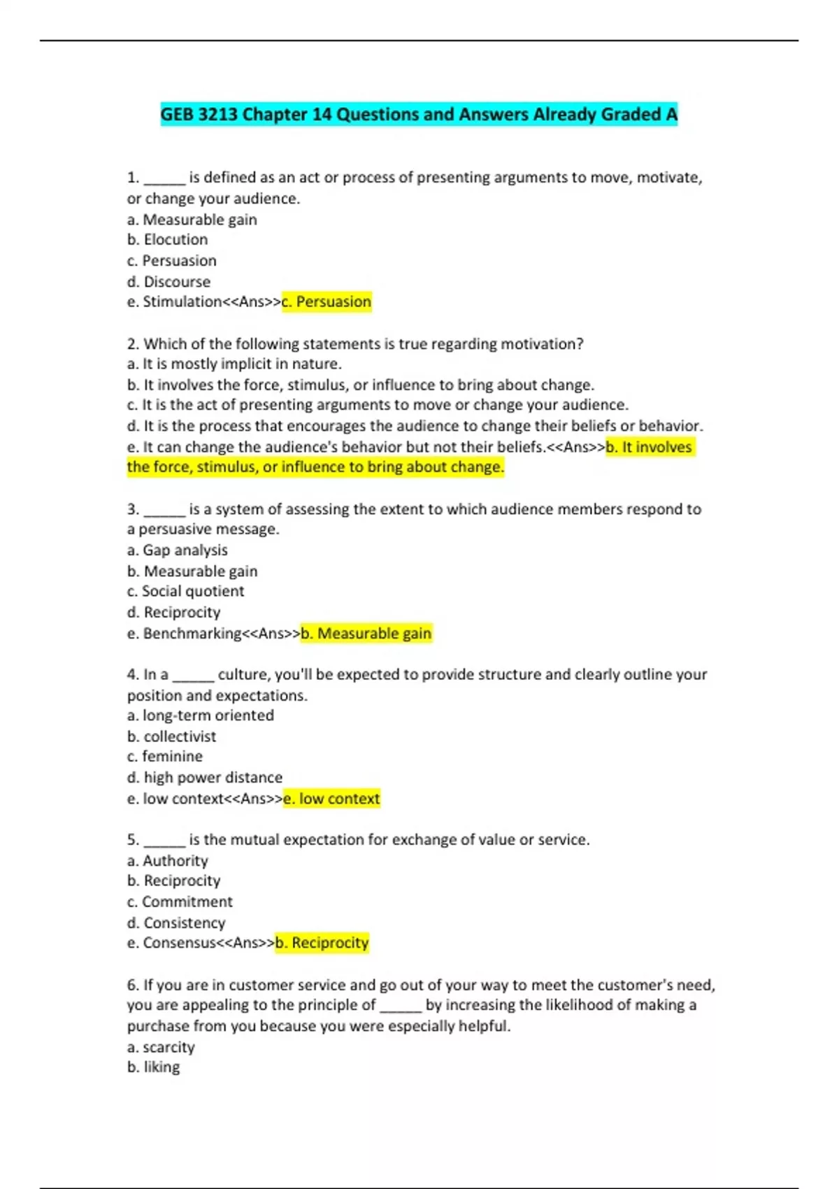 1. _____ is defined as an act or process of presenting arguments to move, motivate, or change your audience. a. Measurable gain b. Elocution c. Persuasion d. Discourse e. Stimulation<<Ans>>c. Persuasion 2. Which of the following statements is true regarding motivation? a. It is mostly implicit in nature. b. It involves the force, stimulus, or influence to bring about change. c. It is the act of presenting arguments to move or change your audience. d. It is the process that encourages the audience to change their beliefs or behavior. e. It can change the audience's behavior but not their beliefs.<<Ans>>b. It involves the force, stimulus, or influence to bring about change. 3. _____ is a system of assessing the extent to which audience members respond to a persuasive message. a. Gap analysis b. Measurable gain c. Social quotient d. Reciprocity e. Benchmarking<<Ans>>b. Measurable gain 4. In a _____ culture, you'll be expected to provide structure and clearly outline your position and expectations. a. long-term oriented b. collectivist c. feminine d. high power distance e. low context<<Ans>>e. low context 5. _____ is the mutual expectation for exchange of value or service. a. Authority b. Reciprocity c. Commitment d. Consistency e. Consensus<<Ans>>b. Reciprocity 6. If you are in customer service and go out of your way to meet the customer's need, you are appealing to the principle of _____ by increasing the likelihood of making a purchase from you because you were especially helpful. a. scarcity b. liking c. consensus d. authority e. reciprocity<<Ans>>e. reciprocity 7. A retailer uses the following messages to advertise a sale: "Limited time offer", "Till stocks last", and "Hurry! This week only!" The retailer is operating on the principle of: a. scarcity. b. consistency. c. authority. d. reciprocity. e. consensus.<<Ans>>a. scarcity. 8. The principle of authority involves: a. the perception of safety and belonging in communication. b. the tendency of the individual to follow peers. c. referencing experts and expertise. d. focusing on the exclusive, the rare, the unusual, and the unique. e. convincing or motivating people to act immediately.<<Ans>>c. referencing experts and expertise. 9. Lawyers and business consultants operate on the principle of: a. reciprocity. b. scarcity. c. liking. d. authority. e. consensus.<<Ans>>d. authority. 10. The tendency to think that a product is good because "everybody else" thinks that it is good is related to the principle of: a. authority. b. consistency. c. consensus. d. reciprocity. e. scarcity.<<Ans>>c. consensus. 11. The tendency to be attracted to people who communicate to us that they like us, and who make us feel good about ourselves is a reflection of: a. the principle of reciprocity. b. the principle of authority. c. the principle of consensus. d. the principle of liking. e. the principle of commitment.<<Ans>>d. the principle of liking. 12. When the operational function of your persuasive speech is _____, you want to reinforce existing beliefs, intensify them, and bring them to the forefront. a. to stimulate b. to convince c. to call to action d. to increase consideration e. to develop tolerance<<Ans>>a. to stimulate