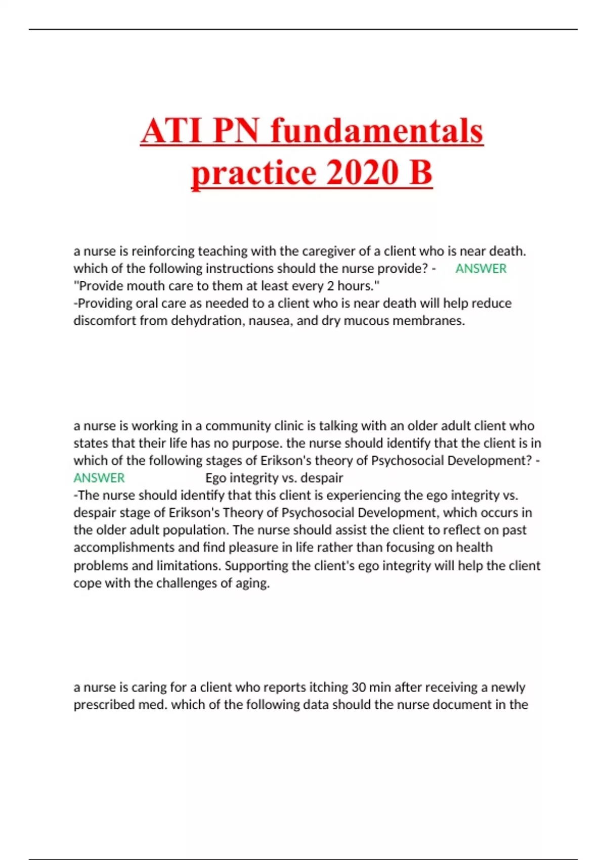 ATI PN fundamentals practice 2020 B a nurse is reinforcing teaching with the caregiver of a client who is near death. which of the following instructions should the nurse provide? - ANSWER "Provide mouth care to them at least every 2 hours." -Providing oral care as needed to a client who is near death will help reduce discomfort from dehydration, nausea, and dry mucous membranes. a nurse is working in a community clinic is talking with an older adult client who states that their life has no purpose. the nurse should identify that the client is in which of the following stages of Erikson's theory of Psychosocial Development? - ANSWER Ego integrity vs. despair -The nurse should identify that this client is experiencing the ego integrity vs. despair stage of Erikson's Theory of Psychosocial Development, which occurs in the older adult population. The nurse should assist the client to reflect on past accomplishments and find pleasure in life rather than focusing on health problems and limitations. Supporting the client's ego integrity will help the client cope with the challenges of aging. a nurse is caring for a client who reports itching 30 min after receiving a newly prescribed med. which of the following data should the nurse document in the client's medical record? - ANSWER Client states, "I started to itch after taking that medication." -The nurse should document information using an objective description, putting the client's exact words in quotation marks.
