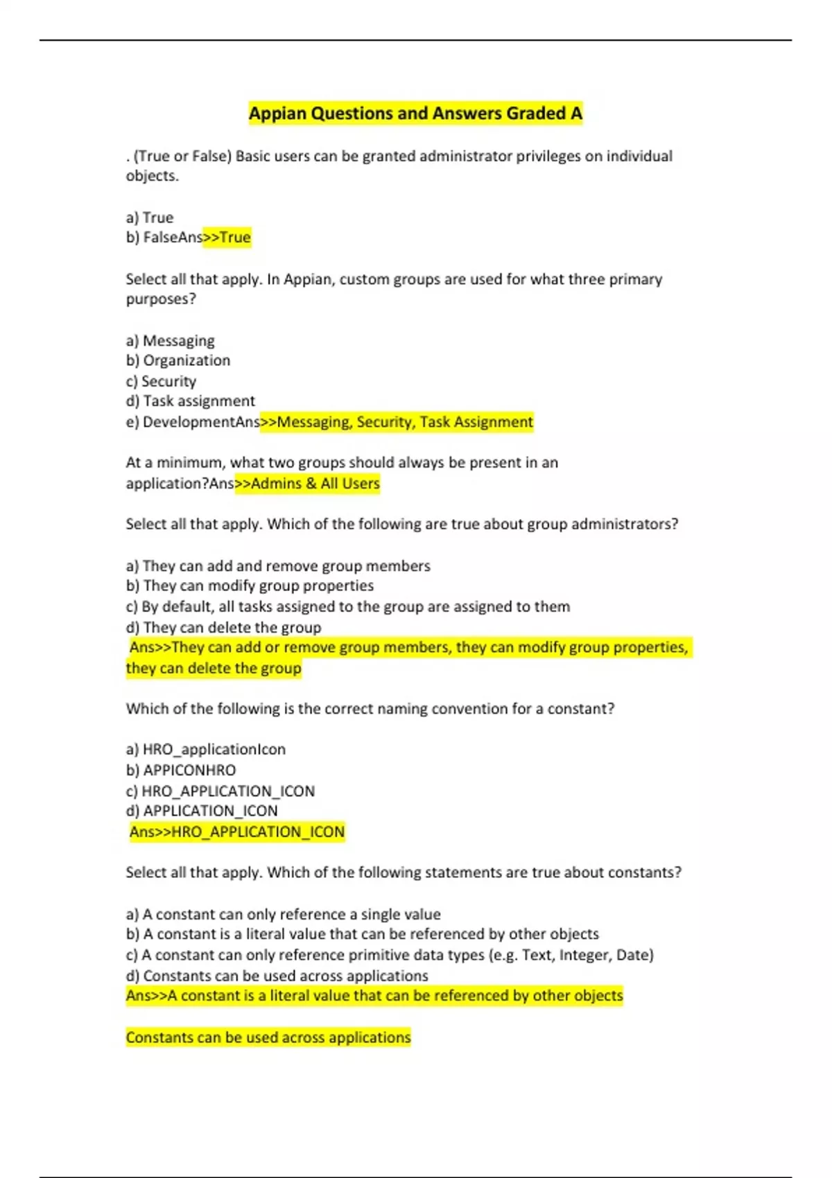 . (True or False) Basic users can be granted administrator privileges on individual objects. a) True b) FalseAns>>True Select all that apply. In Appian, custom groups are used for what three primary purposes? a) Messaging b) Organization c) Security d) Task assignment e) DevelopmentAns>>Messaging, Security, Task Assignment At a minimum, what two groups should always be present in an application?Ans>>Admins & All Users Select all that apply. Which of the following are true about group administrators? a) They can add and remove group members b) They can modify group properties c) By default, all tasks assigned to the group are assigned to them d) They can delete the group Ans>>They can add or remove group members, they can modify group properties, they can delete the group Which of the following is the correct naming convention for a constant? a) HRO_applicationIcon b) APPICONHRO c) HRO_APPLICATION_ICON d) APPLICATION_ICON Ans>>HRO_APPLICATION_ICON Select all that apply. Which of the following statements are true about constants? a) A constant can only reference a single value b) A constant is a literal value that can be referenced by other objects c) A constant can only reference primitive data types (e.g. Text, Integer, Date) d) Constants can be used across applications Ans>>A constant is a literal value that can be referenced by other objects Constants can be used across applications In the space provided, define the purpose of expression rules.Ans>>User created statement that uses functions, variables, literal values and operators to perform an evaluation, calculation or generation of data What would be the result of this expression? a) True b) False c) T d) F Ans>>F When creating a dropdown field, which of the following determines what is displayed to the end user on the interface for each option on the list? a) Value b) Choice values c) Validations d) Choice labels Ans>>Choice Labels Which of the following functions are used to configure validations in a form? a) a!validation() b) if() c) a!validate() d) a!saveIf() Ans>>if() Which of the following is the most correct description of a record? a) Records consolidate business data into a single location to provide a complete picture about a particular item of interest and allow stakeholders to take action on that information. b) Records aggregate information from several sources to provide statistical data about a several items of interest at once. c) Records provide an easy way to view assigned work tasks and control the flow of business processes from a single interface. d) Records draw data from external systems and combine it with process data to provide a contextual picture of business practices.Ans>>Records consolidate business data into a single location to provide a complete picture about a particular item of interest and allow stakeholders to take action on that information. (True or False) An activity class parameter is required when saving data from a form to a process variable in a User Input Task. a) True b) FalseAns>>True