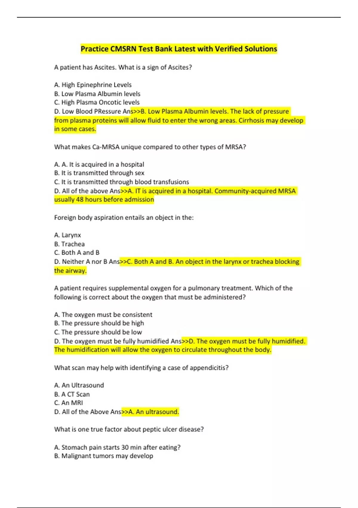 A patient has Ascites. What is a sign of Ascites? A. High Epinephrine Levels B. Low Plasma Albumin levels C. High Plasma Oncotic levels D. Low Blood PRessure Ans>>B. Low Plasma Albumin levels. The lack of pressure from plasma proteins will allow fluid to enter the wrong areas. Cirrhosis may develop in some cases. What makes Ca-MRSA unique compared to other types of MRSA? A. A. It is acquired in a hospital B. It is transmitted through sex C. It is transmitted through blood transfusions D. All of the above Ans>>A. IT is acquired in a hospital. Community-acquired MRSA usually 48 hours before admission Foreign body aspiration entails an object in the: A. Larynx B. Trachea C. Both A and B D. Neither A nor B Ans>>C. Both A and B. An object in the larynx or trachea blocking the airway. A patient requires supplemental oxygen for a pulmonary treatment. Which of the following is correct about the oxygen that must be administered? A. The oxygen must be consistent B. The pressure should be high C. The pressure should be low D. The oxygen must be fully humidified Ans>>D. The oxygen must be fully humidified. The humidification will allow the oxygen to circulate throughout the body. What scan may help with identifying a case of appendicitis? A. An Ultrasound B. A CT Scan C. An MRI D. All of the Above Ans>>A. An ultrasound. What is one true factor about peptic ulcer disease? A. Stomach pain starts 30 min after eating? B. Malignant tumors may develop C. An endoscopy is needed D. NSAID use may be a concern Ans>>C. An endoscopy is needed to diagnose peptic ulcer disease. It will take a few hours for stomach pain to develop A person has sickle cell disease. Which of the following is a correct statement based on his or her medical condition? A. The person has less free hemoglobin B. Nitric oxide totals will drop C. Arterial pressure may change D. Sildenafil may resolve blood-related concerns Ans>>B. Nitric oxide totals will drop. This is due to the sickle cell disease, Hemolysis will develop and free hemoglobin will increase due to the unusual shapes of the blood cells A person who has hepatitis C and significant liver damage may require: A. Antiviral medication B. Bedrest C. A Liver transplant D. A blood transfusion Ans>>C. A liver transplant. The liver may be unable tp function properly. What form of Hepatitis is transmitted by exposure to contaminated water or food? A. A B. B C. C D. D Ans>>A. A What is an ideal ICP rating? A. 15 B. 25 C. 35 D. 40 Ans>>A. 15 the normal range is <20 What test should be performed on a patient experiencing intense fatigue and lethargy? A. A CT Scan B. A Pan culture C. An airway exam D. A fluid test Ans>>A. A CT Scan. To rule out mental cerebral changes A patient requires intracranial surgery. When should antibiotics be prescribed? A. Before the surgery B. During the surgery C. After the patient is stable D. Avoid adding antibiotics Ans>>C. After the patient is stable. Antibiotics may not be necessary in every case