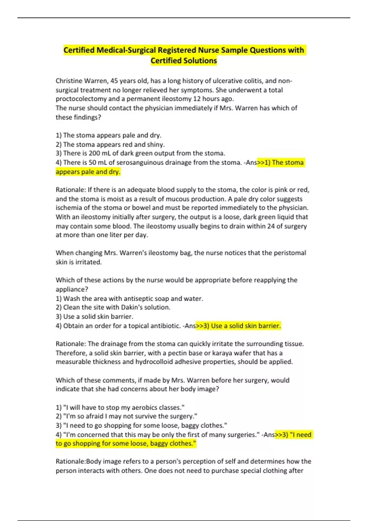 Certified Medical-Surgical Registered Nurse Sample Questions with Certified Solutions