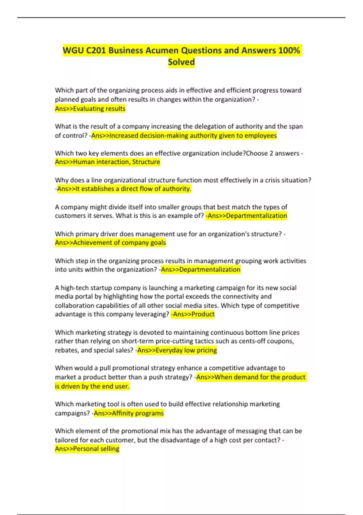 WGU C201 Business Acumen Questions and Answers 100% Solved