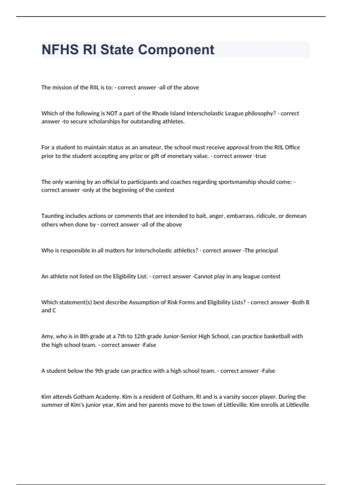 The mission of the RIIL is to: all of the above Which of the following is NOT a part of the Rhode Island Interscholastic League philosophy? to secure scholarships for outstanding athletes. For a student to maintain status as an amateur, the school must receive approval from the RIIL Office prior to the student accepting any prize or gift of monetary value. true The only warning by an official to participants and coaches regarding sportsmanship should come: only at the beginning of the contest Taunting includes actions or comments that are intended to bait, anger, embarrass, ridicule, or demean others when done by all of the above Who is responsible in all matters for interscholastic athletics? The principal An athlete not listed on the Eligibility List: Cannot play in any league contest Which statement(s) best describe Assumption of Risk Forms and Eligibility Lists? Both B and C Amy, who is in 8th grade at a 7th to 12th grade Junior-Senior High School, can practice basketball with the high school team. False A student below the 9th grade can practice with a high school team. False