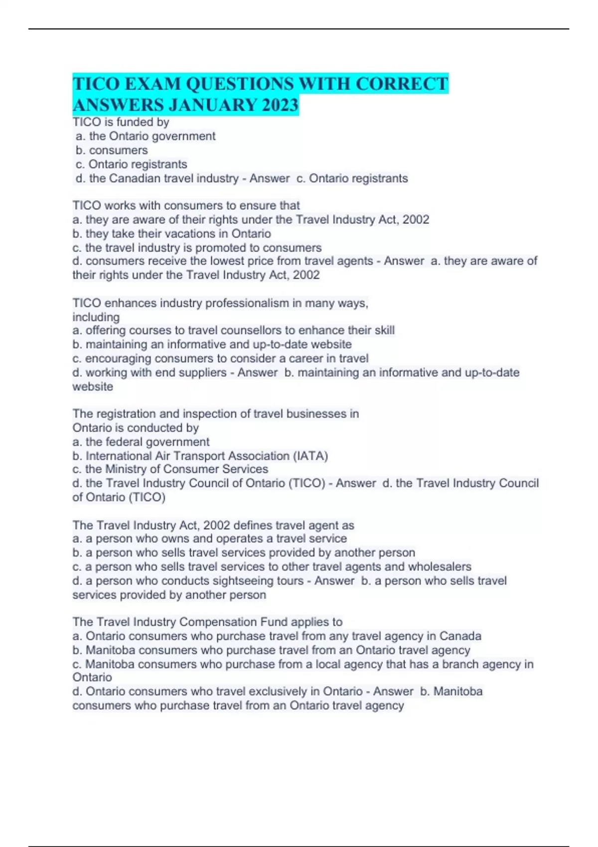 TICO is funded by a. the Ontario government b. consumers c. Ontario registrants d. the Canadian travel industry - Answer c. Ontario registrants TICO works with consumers to ensure that a. they are aware of their rights under the Travel Industry Act, 2002 b. they take their vacations in Ontario c. the travel industry is promoted to consumers d. consumers receive the lowest price from travel agents - Answer a. they are aware of their rights under the Travel Industry Act, 2002 TICO enhances industry professionalism in many ways, including a. offering courses to travel counsellors to enhance their skill b. maintaining an informative and up-to-date website c. encouraging consumers to consider a career in travel d. working with end suppliers - Answer b. maintaining an informative and up-to-date website The registration and inspection of travel businesses in Ontario is conducted by a. the federal government b. International Air Transport Association (IATA) c. the Ministry of Consumer Services d. the Travel Industry Council of Ontario (TICO) - Answer d. the Travel Industry Council of Ontario (TICO) The Travel Industry Act, 2002 defines travel agent as a. a person who owns and operates a travel service b. a person who sells travel services provided by another person c. a person who sells travel services to other travel agents and wholesalers d. a person who conducts sightseeing tours - Answer b. a person who sells travel services provided by another person The Travel Industry Compensation Fund applies to a. Ontario consumers who purchase travel from any travel agency in Canada b. Manitoba consumers who purchase travel from an Ontario travel agency c. Manitoba consumers who purchase from a local agency that has a branch agency in Ontario d. Ontario consumers who travel exclusively in Ontario - Answer b. Manitoba consumers who purchase travel from an Ontario travel agency