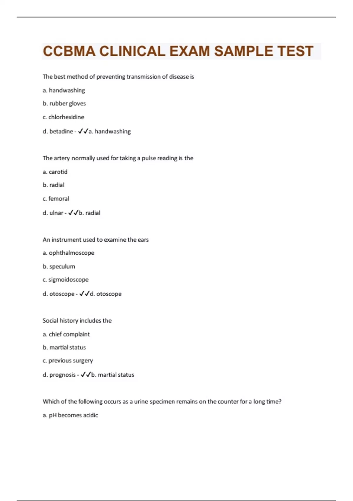 The best method of preventing transmission of disease is a. handwashing b. rubber gloves c. chlorhexidine d. betadine - a. handwashing The artery normally used for taking a pulse reading is the a. carotid b. radial c. femoral d. ulnar - b. radial An instrument used to examine the ears a. ophthalmoscope b. speculum c. sigmoidoscope d. otoscope - d. otoscope Social history includes the a. chief complaint b. martial status c. previous surgery d. prognosis - b. martial status Which of the following occurs as a urine specimen remains on the counter for a long time? a. pH becomes acidicb. bacteria multiply c. glycouria begins d. urine remains constant - b. bacteria multiply
