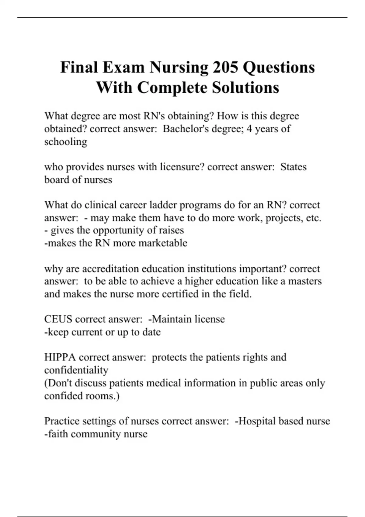 What degree are most RN's obtaining? How is this degree obtained? correct answer: Bachelor's degree; 4 years of schooling who provides nurses with licensure? correct answer: States board of nurses What do clinical career ladder programs do for an RN? correct answer: - may make them have to do more work, projects, etc. - gives the opportunity of raises -makes the RN more marketable why are accreditation education institutions important? correct answer: to be able to achieve a higher education like a masters and makes the nurse more certified in the field. CEUS correct answer: -Maintain license -keep current or up to date HIPPA correct answer: protects the patients rights and confidentiality (Don't discuss patients medical information in public areas only confided rooms.) Practice settings of nurses correct answer: -Hospital based nurse