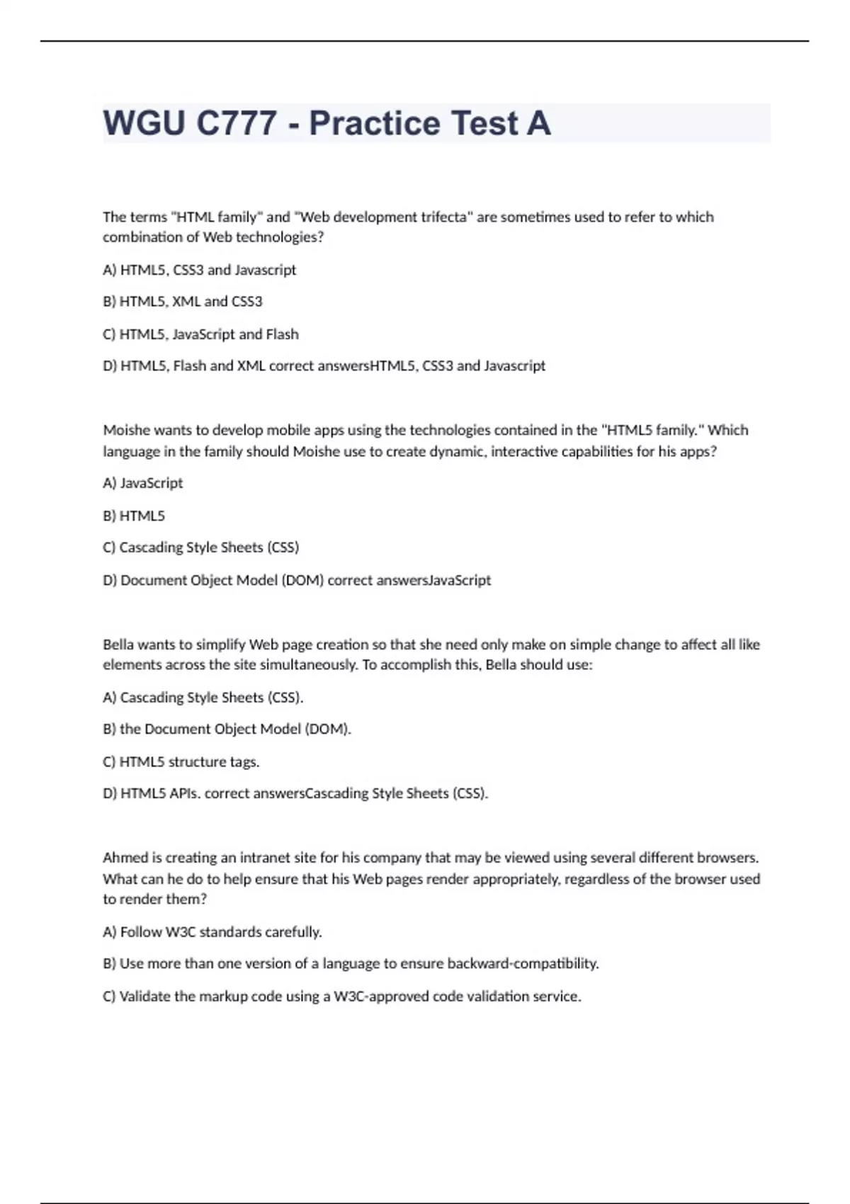 The terms "HTML family" and "Web development trifecta" are sometimes used to refer to which combination of Web technologies? A) HTML5, CSS3 and Javascript B) HTML5, XML and CSS3 C) HTML5, JavaScript and Flash D) HTML5, Flash and XML correct answersHTML5, CSS3 and Javascript Moishe wants to develop mobile apps using the technologies contained in the "HTML5 family." Which language in the family should Moishe use to create dynamic, interactive capabilities for his apps? A) JavaScript B) HTML5 C) Cascading Style Sheets (CSS) D) Document Object Model (DOM) correct answersJavaScript Bella wants to simplify Web page creation so that she need only make on simple change to affect all like elements across the site simultaneously. To accomplish this, Bella should use: A) Cascading Style Sheets (CSS). B) the Document Object Model (DOM). C) HTML5 structure tags. D) HTML5 APIs. correct answersCascading Style Sheets (CSS). Ahmed is creating an intranet site for his company that may be viewed using several different browsers. What can he do to help ensure that his Web pages render appropriately, regardless of the browser used to render them? A) Follow W3C standards carefully. B) Use more than one version of a language to ensure backward-compatibility. C) Validate the markup code using a W3C-approved code validation service.