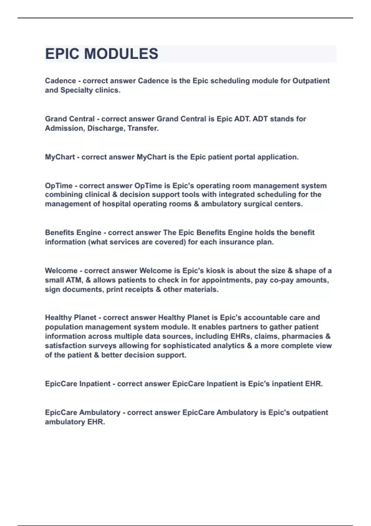 Cadence Cadence is the Epic scheduling module for Outpatient and Specialty clinics. Grand Central Grand Central is Epic ADT. ADT stands for Admission, Discharge, Transfer. MyChart MyChart is the Epic patient portal application. OpTime OpTime is Epic's operating room management system combining clinical & decision support tools with integrated scheduling for the management of hospital operating rooms & ambulatory surgical centers. Benefits Engine The Epic Benefits Engine holds the benefit information (what services are covered) for each insurance plan. Welcome Welcome is Epic's kiosk is about the size & shape of a small ATM, & allows patients to check in for appointments, pay co-pay amounts, sign documents, print receipts & other materials. Healthy Planet Healthy Planet is Epic's accountable care and population management system module. It enables partners to gather patient information across multiple data sources, including EHRs, claims, pharmacies & satisfaction surveys allowing for sophisticated analytics & a more complete view of the patient & better decision support. EpicCare Inpatient EpicCare Inpatient is Epic's inpatient EHR. EpicCare Ambulatory EpicCare Ambulatory is Epic's outpatient ambulatory EHR. Wisdom Wisdom is Epic's dental module. Willow Willow is Epic's pharmacy system. Officially known as the "Willow Inpatient Pharmacy System". Stork Stork is Epic's obstetrics module for managing pregnancy episodes on the Outpatient side, and documenting deliveries in the hospital. Radiant Radiant is Epic's Radiology module. It provides documentation, film tracking, and viewing of Radiology images. Phoenix Phoenix is Epic's transplant module. It supports the focused clinical workflows and detailed regulatory requirements of solid organ transplants. Cupid Cupid is Epic's cardiology module. There are special clinical tools focused on cardiology care. Epic can integrate with external EKG devices to bring the EKG readings into the medical record. BedTime BedTime is Epic's bed management module. Beacon Beacon is Epic's oncology module. It is the chemotherapy module in Epic. It is built around treatment plans for patients who are undergoing cancer treatment. Whereas most patient visits are either Outpatient or Inpatient, these visits are considered Series Visit Types, which span a longer amount of time. ASAP ASAP is Epic's ER module. It tracks which rooms are occupied, displaying room and bed status on monitors that are mounted on the walls near the nursing stations. Anesthesia Anesthesia is Epic's anesthesia module. CareEverywhere CareEverywhere is Epic's information exchange application for caregivers that use Epic. It allows doctors & nurses across multiple organization to electronically exchange patient medical information so long as they are on Epic. Connect Formerly "Community Connect", Connect is Epic's structured method for sharing an electronic record system to independent physician practices and hospitals, including e-learning content, user training and support specialists. EpicCare Link EpicCare Link is Epic's web-based application for connecting organizations to their community affiliates. It allows independent physicians to easily refer & follow up with patient progress through a read only, secure, web-based access. Home Health Home Health is Epic's Home Health module that allows visiting caregivers (Nurse, Nurse Aides, PT, OT, etc) document care done in a patient's home. Clinicians use a remotely installed software program that allows them to document in settings where they might not have any Internet connection. Then after they finish their work, they can reconnect to their organization's network and perform a sync that uploads their documentation to the main Epic servers. Resolute Resolute is Epic's Hospital Billing (HB) and Professional Billing (PB) system. It manages revenue cycle and overall billing. HIM HIM stands for Health Information Management, which provides tools to simplify medical records management tasks, including chart and film tracking, chart deficiencies, release of information and coding and abstracting.