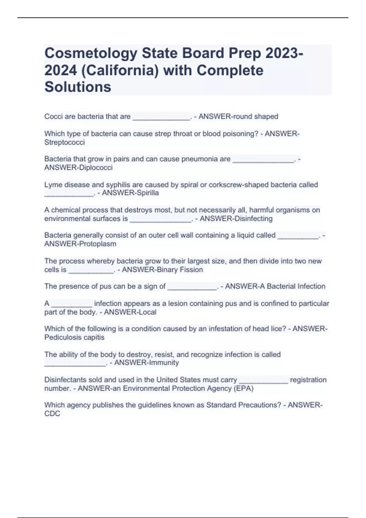 Cosmetology State Board Prep (California) with Complete SolutionsCosmetology State Board Prep (California) with Complete SolutionsCosmetology State Board Prep (California) with Complete SolutionsCocci are bacteria that are ______________. - ANSWER-round shaped Which type of bacteria can cause strep throat or blood poisoning? - ANSWER-Streptococci Bacteria that grow in pairs and can cause pneumonia are _______________. - ANSWER-Diplococci Lyme disease and syphilis are caused by spiral or corkscrew-shaped bacteria called ____________. - ANSWER-Spirilla A chemical process that destroys most, but not necessarily all, harmful organisms on environmental surfaces is _______________. - ANSWER-Disinfecting Bacteria generally consist of an outer cell wall containing a liquid called __________. - ANSWER-Protoplasm The process whereby bacteria grow to their largest size, and then divide into two new cells is ___________. - ANSWER-Binary Fission The presence of pus can be a sign of ____________. - ANSWER-A Bacterial Infection A __________ infection appears as a lesion containing pus and is confined to particular part of the body. - ANSWER-Local Which of the following is a condition caused by an infestation of head lice? - ANSWER-Pediculosis capitis The ability of the body to destroy, resist, and recognize infection is called _______________. - ANSWER-Immunity