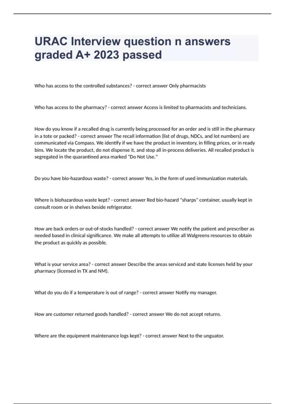 URAC Interview question n answers graded A+ 2023 passedWho has access to the controlled substances? - correct answer Only pharmacists Who has access to the pharmacy? - correct answer Access is limited to pharmacists and technicians. How do you know if a recalled drug is currently being processed for an order and is still in the pharmacy in a tote or packed? - correct answer The recall information (list of drugs, NDCs, and lot numbers) are communicated via Compass. We identify if we have the product in inventory, in filling prices, or in ready bins. We locate the product, do not dispense it, and stop all in-process deliveries. All recalled product is segregated in the quarantined area marked "Do Not Use." Do you have bio-hazardous waste? - correct answer Yes, in the form of used immunization materials. Where is biohazardous waste kept? - correct answer Red bio-hazard "sharps" container, usually kept in consult room or in shelves beside refrigerator. How are back orders or out-of-stocks handled? - correct answer We notify the patient and prescriber as needed based in clinical significance. We make all attempts to utilize all Walgreens resources to obtain the product as quickly as possible. What is your service area? - correct answer Describe the areas serviced and state licenses held by your pharmacy (licensed in TX and NM). What do you do if a temperature is out of range? - correct answer Notify my manager. How are customer returned goods handled? - correct answer We do not accept returns. Where are the equipment maintenance logs kept? - correct answer Next to the unguator. How is the equipment used in the pharmacy cleaned, calibrated, random tested, and audited? (I.e. scales, pill counters, and hoods). - correct answer All equipment is cleaned every day. Scales are calibrated every day. Random testing is done monthly and documented on the Equipment Log. The log is signed by a pharmacist at the end of each month to ensure tests were completed as the audit. What are your triggers to send a call to an RPh? - correct answer If the patient has any clinical questions or concerns we have a pharmacist speak with them. What is your involvement in Patient Management? - correct answer Patient management involves prescription dispensing, reimbursement, counseling, and patient clinical care activities. My involvement depends on the role I am assigned for the day.