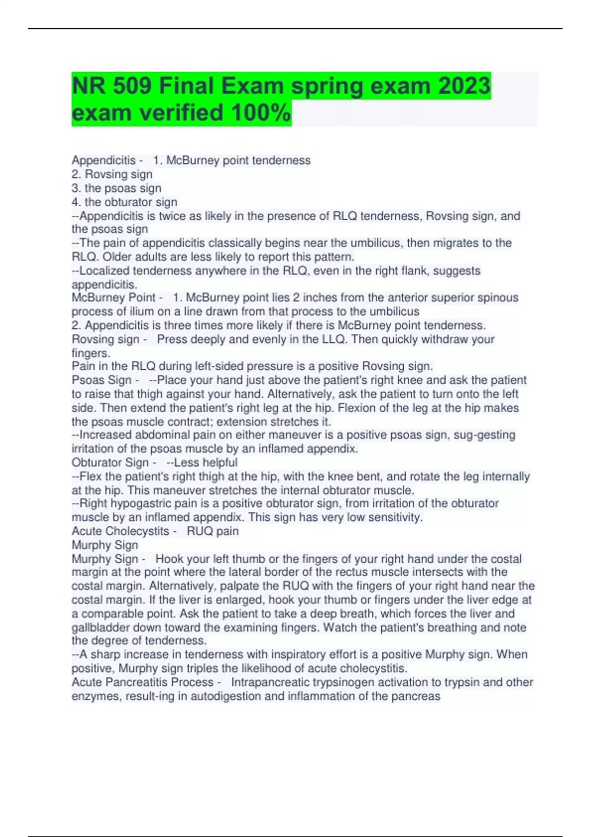 NR 509 Final Exam spring exam 2023 exam verified 100% Appendicitis - 1. McBurney point tenderness 2. Rovsing sign 3. the psoas sign 4. the obturator sign --Appendicitis is twice as likely in the presence of RLQ tenderness, Rovsing sign, and the psoas sign --The pain of appendicitis classically begins near the umbilicus, then migrates to the RLQ. Older adults are less likely to report this pattern. --Localized tenderness anywhere in the RLQ, even in the right flank, suggests appendicitis. McBurney Point - 1. McBurney point lies 2 inches from the anterior superior spinous process of ilium on a line drawn from that process to the umbilicus 2. Appendicitis is three times more likely if there is McBurney point tenderness. Rovsing sign - Press deeply and evenly in the LLQ. Then quickly withdraw your fingers. Pain in the RLQ during left-sided pressure is a positive Rovsing sign. Psoas Sign - --Place your hand just above the patient's right knee and ask the patient to raise that thigh against your hand. Alternatively, ask the patient to turn onto the left side. Then extend the patient's right leg at the hip. Flexion of the leg at the hip makes the psoas muscle contract; extension stretches it. --Increased abdominal pain on either maneuver is a positive psoas sign, sug-gesting irritation of the psoas muscle by an inflamed appendix. Obturator Sign - --Less helpful --Flex the patient's right thigh at the hip, with the knee bent, and rotate the leg internally at the hip. This maneuver stretches the internal obturator muscle. --Right hypogastric pain is a positive obturator sign, from irritation of the obturator muscle by an inflamed appendix. This sign has very low sensitivity. Acute Cholecystits - RUQ pain Murphy Sign Murphy Sign - Hook your left thumb or the fingers of your right hand under the costal margin at the point where the lateral border of the rectus muscle intersects with the costal margin. Alternatively, palpate the RUQ with the fingers of your right hand near the costal margin. If the liver is enlarged, hook your thumb or fingers under the liver edge at a comparable point. Ask the patient to take a deep breath, which forces the liver and gallbladder down toward the examining fingers. Watch the patient's breathing and note the degree of tenderness. --A sharp increase in tenderness with inspiratory effort is a positive Murphy sign. When positive, Murphy sign triples the likelihood of acute cholecystitis. Acute Pancreatitis Process - Intrapancreatic trypsinogen activation to trypsin and other enzymes, result-ing in autodigestion and inflammation of the pancreas Acute Pancreatitis Location - Epigastric, may radiate straight to the back or other areas of the abdomen; 20% with severe sequelae of organ failure Acute Pancreatitis Quality - Usually steady Acute PancreatitisTiming - Acute onset, persistent pain Acute Pancreatitis Aggrevating Factors - Lying supine; dyspnea if pleural effusions from capillary leak syn-drome; selected medications, high triglycerides may exacerbate Acute Pancreatitis Relieving factors - Leaning forward with trunk flexed Acute Pancreatitis Associated Symptoms and Setting - Nausea, vomiting, abdominal dis-tention, fever; often recurrent; 80% with history of alcohol abuse or gallstones Peptic Ulcer Disease Process - Mucosal ulcer in stomach or duode-num >5 mm, covered with fibrin, ex-tending through the muscularis mu-cosa; H. pylori infection present in 90% of peptic ulcers Peptic Ulcer Disease Location - Epigastric, may radiate straight to the back Peptic Ulcer Disease Quality - Variable: epigastric gnawing or burning (dyspepsia); may also be boring, aching, or hungerlike No symptoms in up to 20% Peptic Ulcer Disease Timing - Intermittent; duodenal ulcer is more likely than gastric ulcer or dyspepsia to cause pain that (1) wakes the patient at night, and (2) occurs intermittently over a few wks, disappears for months, then recurs Peptic Ulcer Disease aggravating factors - Variable Peptic Ulcer Disease relieving factors - Food and antacids may bring re-lief (less likely in gastric ulcers) Peptic Ulcer Disease associated symptoms and setting - Nausea, vomiting, belching, bloating; heartburn (more common in duodenal ulcer); weight loss (more common in gastric ulcer); dyspepsia is more com-mon in the young (20-29 yrs), gastric ulcer in those over 50 yrs, and duodenal ulcer in those 30-60 yrs GERD Process - Prolonged exposure of esophagus to gastric acid due to impaired esopha-geal motility or excess relaxations of the lower esophageal sphincter; Helico-bacter pylori may be present GERD Location - Chest or epigastric GERD Quality - Heartburn, regurgitation GERD timing - After meals, especially spicy foods GERD aggravating factors - Lying down, bending over; physical activity; diseases such as scleroderma, gastroparesis; drugs like nicotine that relax the lower esophageal sphincter GERD : relieving factors - Antacids, proton pump inhibi-tors; avoiding alcohol, smoking, fatty meals, chocolate, selected drugs such as theophylline, cal-cium channel blockers GERD associated symptoms and setting - Wheezing, chronic cough, short-ness of breath, hoarseness, choking sensation, dysphagia, regurgitation, halitosis, sore throat; increases risk of Barrett esophagus and esopha-geal cancer Diverticulitis process - Acute inflammation of colonic diver-ticula, outpouchings 5-10 mm in di-ameter, usually in sigmoid or descend-ing colon Diverticulitis location - Left lower quadrant Diverticulitis quality - May be cramping at first, then steady Diverticulitis timing - Often grad
