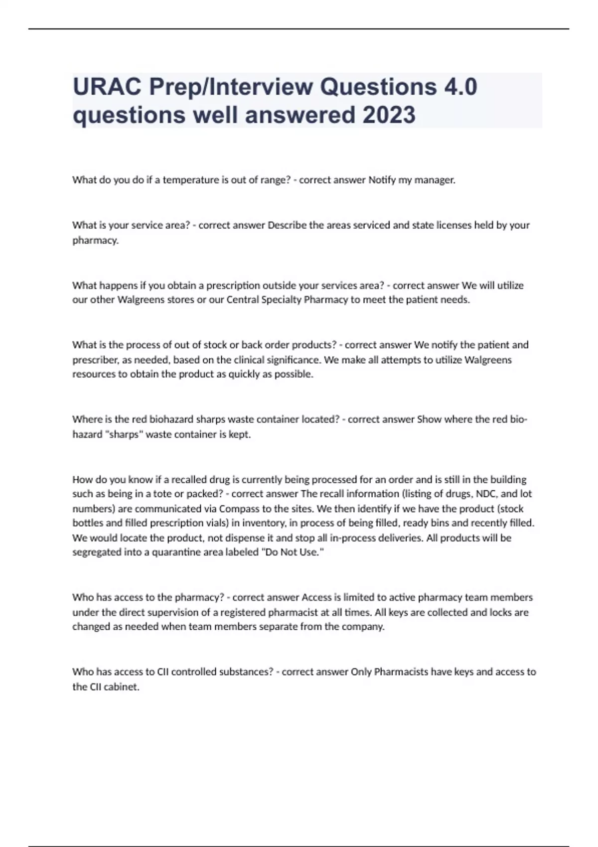 URAC Prep/Interview Questions 4.0 questions well answered 2023What do you do if a temperature is out of range? - correct answer Notify my manager. What is your service area? - correct answer Describe the areas serviced and state licenses held by your pharmacy. What happens if you obtain a prescription outside your services area? - correct answer We will utilize our other Walgreens stores or our Central Specialty Pharmacy to meet the patient needs. What is the process of out of stock or back order products? - correct answer We notify the patient and prescriber, as needed, based on the clinical significance. We make all attempts to utilize Walgreens resources to obtain the product as quickly as possible. Where is the red biohazard sharps waste container located? - correct answer Show where the red bio-hazard "sharps" waste container is kept. How do you know if a recalled drug is currently being processed for an order and is still in the building such as being in a tote or packed? - correct answer The recall information (listing of drugs, NDC, and lot numbers) are communicated via Compass to the sites. We then identify if we have the product (stock bottles and filled prescription vials) in inventory, in process of being filled, ready bins and recently filled. We would locate the product, not dispense it and stop all in-process deliveries. All products will be segregated into a quarantine area labeled "Do Not Use." Who has access to the pharmacy? - correct answer Access is limited to active pharmacy team members under the direct supervision of a registered pharmacist at all times. All keys are collected and locks are changed as needed when team members separate from the company. Who has access to CII controlled substances? - correct answer Only Pharmacists have keys and access to the CII cabinet. How are patient medication returns handled? - correct answer