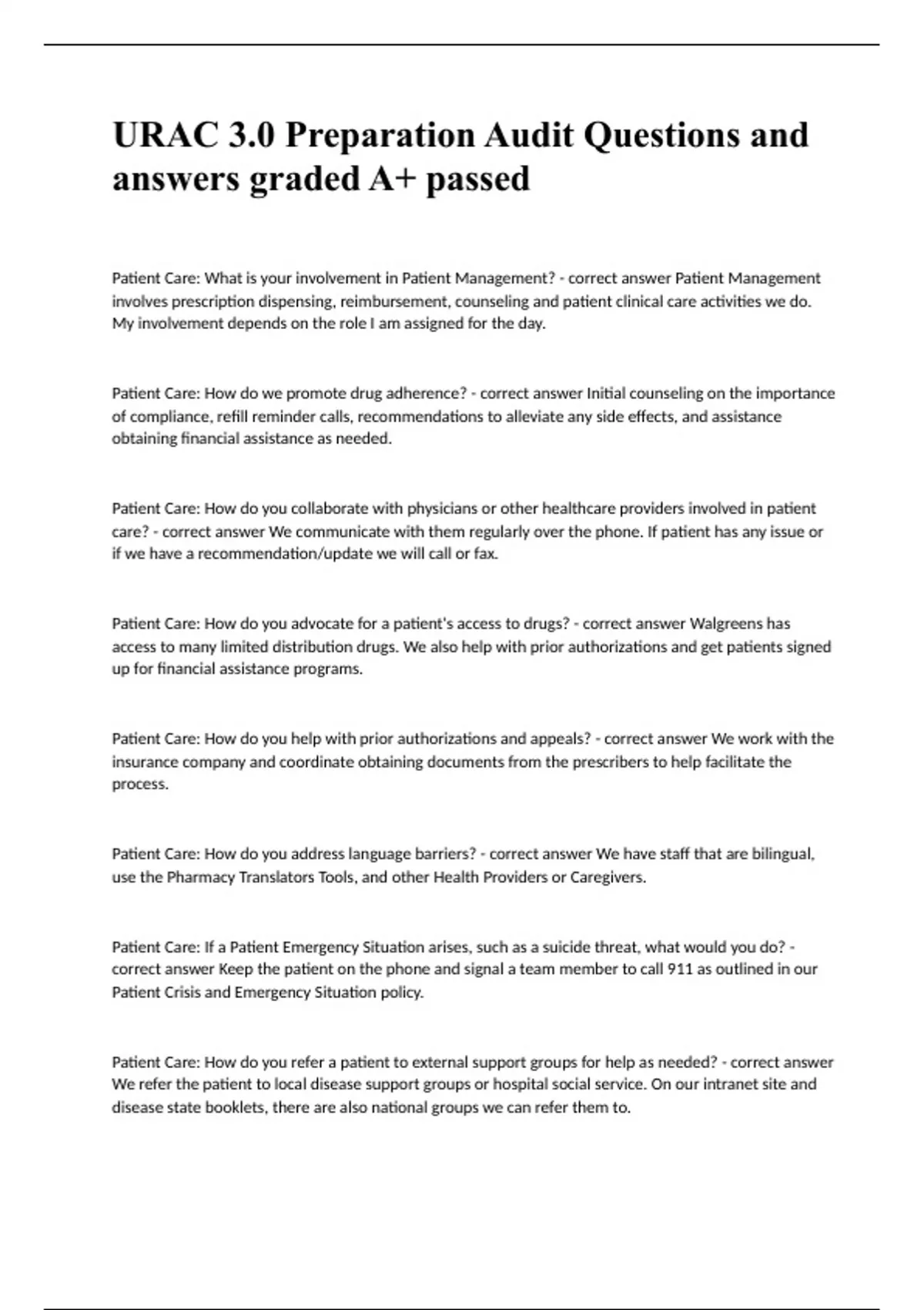 URAC 3.0 Preparation Audit Questions and answers graded A+ passed Patient Care: What is your involvement in Patient Management? - correct answer Patient Management involves prescription dispensing, reimbursement, counseling and patient clinical care activities we do. My involvement depends on the role I am assigned for the day. Patient Care: How do we promote drug adherence? - correct answer Initial counseling on the importance of compliance, refill reminder calls, recommendations to alleviate any side effects, and assistance obtaining financial assistance as needed. Patient Care: How do you collaborate with physicians or other healthcare providers involved in patient care? - correct answer We communicate with them regularly over the phone. If patient has any issue or if we have a recommendation/update we will call or fax. Patient Care: How do you advocate for a patient's access to drugs? - correct answer Walgreens has access to many limited distribution drugs. We also help with prior authorizations and get patients signed up for financial assistance programs. Patient Care: How do you help with prior authorizations and appeals? - correct answer We work with the insurance company and coordinate obtaining documents from the prescribers to help facilitate the process. Patient Care: How do you address language barriers? - correct answer We have staff that are bilingual, use the Pharmacy Translators Tools, and other Health Providers or Caregivers. Patient Care: If a Patient Emergency Situation arises, such as a suicide threat, what would you do? - correct answer Keep the patient on the phone and signal a team member to call 911 as outlined in our Patient Crisis and Emergency Situation policy.