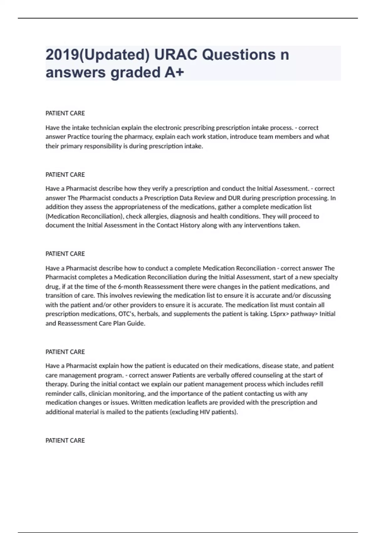 2019(Updated) URAC Questions n answers graded A+ PATIENT CARE Have the intake technician explain the electronic prescribing prescription intake process. - correct answer Practice touring the pharmacy, explain each work station, introduce team members and what their primary responsibility is during prescription intake. PATIENT CARE Have a Pharmacist describe how they verify a prescription and conduct the Initial Assessment. - correct answer The Pharmacist conducts a Prescription Data Review and DUR during prescription processing. In addition they assess the appropriateness of the medications, gather a complete medication list (Medication Reconciliation), check allergies, diagnosis and health conditions. They will proceed to document the Initial Assessment in the Contact History along with any interventions taken. PATIENT CARE Have a Pharmacist describe how to conduct a complete Medication Reconciliation - correct answer The Pharmacist completes a Medication Reconciliation during the Initial Assessment, start of a new specialty drug, if at the time of the 6-month Reassessment there were changes in the patient medications, and transition of care. This involves reviewing the medication list to ensure it is accurate and/or discussing with the patient and/or other providers to ensure it is accurate. The medication list must contain all prescription medications, OTC's, herbals, and supplements the patient is taking. LSprx> pathway> Initial and Reassessment Care Plan Guide. PATIENT CARE Have a Pharmacist explain how the patient is educated on their medications, disease state, and patient care management program. - correct answer Patients are verbally offered counseling at the start of therapy. During the initial contact we explain our patient management process which includes refill reminder calls, clinician monitoring, and the importance of the patient contacting us with any medication changes or issues. Written medication leaflets are provided with the prescription and additional material is mailed to the patients (excluding HIV patients). PATIENT CARE