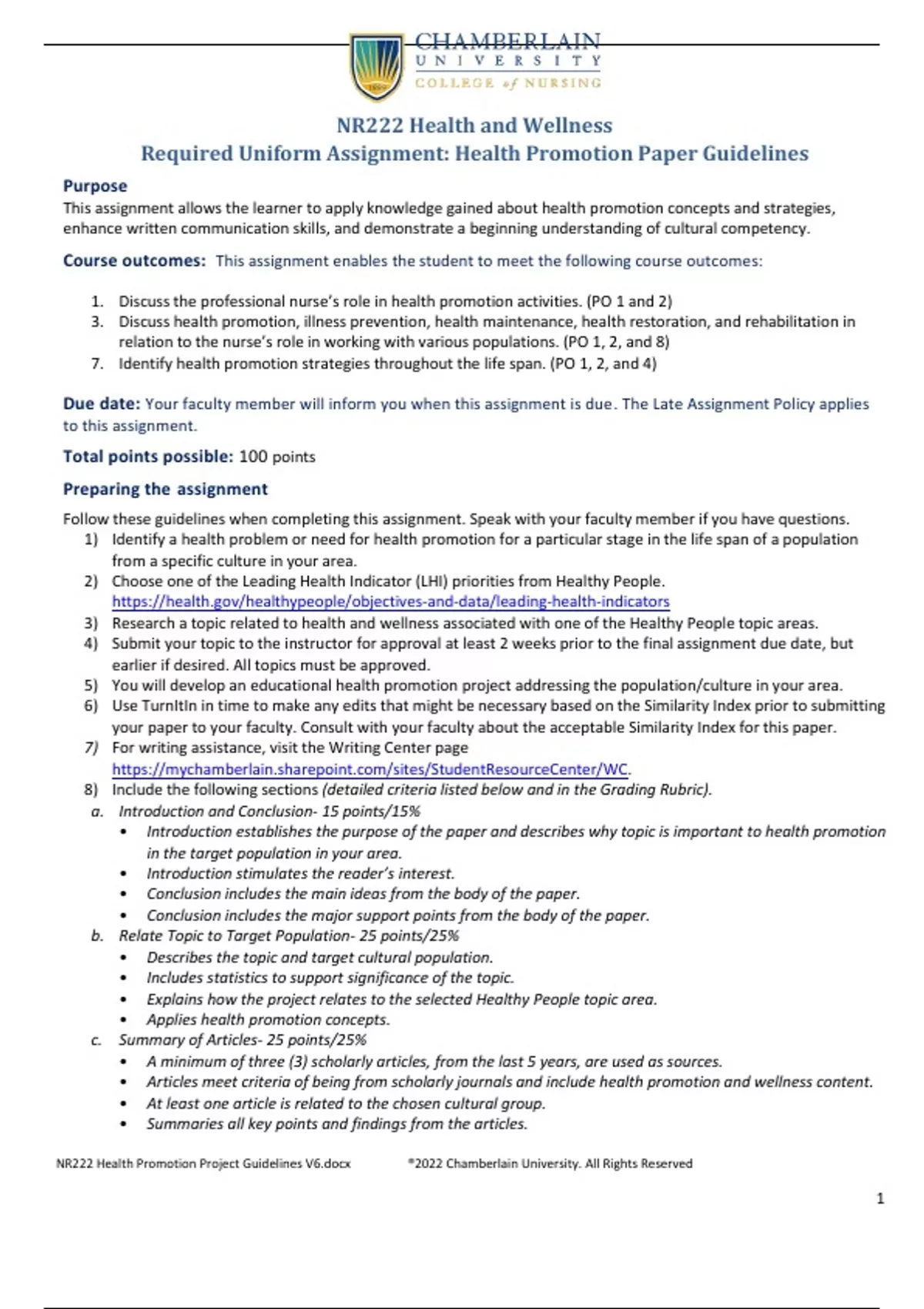 NR222 Health and Wellness Required Uniform Assignment: Health Promotion Paper Guidelines