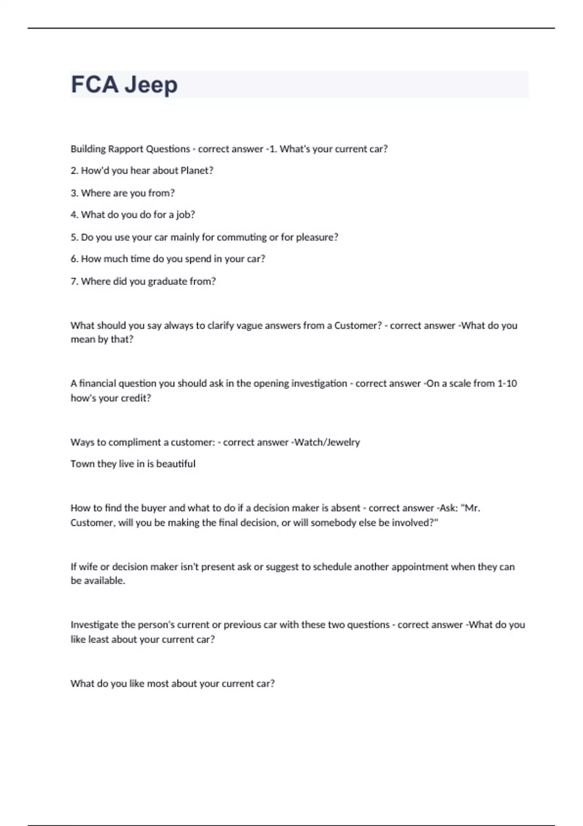 Building Rapport Questions 1. What's your current car? 2. How'd you hear about Planet? 3. Where are you from? 4. What do you do for a job? 5. Do you use your car mainly for commuting or for pleasure? 6. How much time do you spend in your car? 7. Where did you graduate from? What should you say always to clarify vague answers from a Customer? What do you mean by that? A financial question you should ask in the opening investigation On a scale from 1-10 how's your credit? Ways to compliment a customer: Watch/Jewelry Town they live in is beautiful How to find the buyer and what to do if a decision maker is absent Ask: "Mr. Customer, will you be making the final decision, or will somebody else be involved?" If wife or decision maker isn't present ask or suggest to schedule another appointment when they can be available. Investigate the person's current or previous car with these two questions What do you like least about your current car? What do you like most about your current car? Why is that? Amiable Style / a person who is curious and relationship oriented wants a salesman who: 1. Takes it slow in building rapport 2. Explains how things work 3. Reassures they'll be comfortable with their choice 4. Salesman is patient Driver Style / Action oriented and quick decision maker wants a salesman who: 1. Focuses on business 2. Doesn't dance around the process 3. Provides options and lets them choose Expressive style / people oriented and wants to be liked wants a salesman who: 1. Show interest in them and let them talk 2. Help them stay on topic 3. Keep the process moving Analytic style / needs to be right and get details wants a salesman who: 1. avoid chit-chat 2. Compliment their research 3. Know your facts 4. Give them time to think