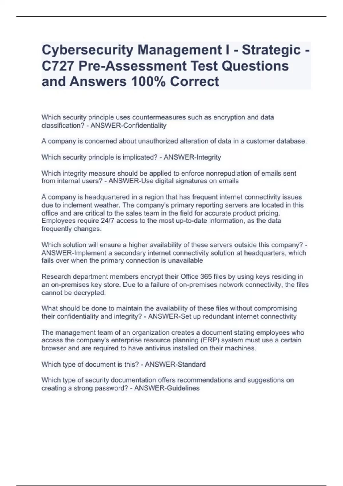 Cybersecurity Management I - Strategic - C727 Pre-Assessment Test Questions and Answers 100% CorrectCybersecurity Management I - Strategic - C727 Pre-Assessment Test Questions and Answers 100% CorrectCybersecurity Management I - Strategic - C727 Pre-Assessment Test Questions and Answers 100% Correct Which security principle uses countermeasures such as encryption and data classification? - ANSWER-Confidentiality A company is concerned about unauthorized alteration of data in a customer database. Which security principle is implicated? - ANSWER-Integrity Which integrity measure should be applied to enforce nonrepudiation of emails sent from internal users? - ANSWER-Use digital signatures on emails A company is headquartered in a region that has frequent internet connectivity issues due to inclement weather. The company's primary reporting servers are located in this office and are critical to the sales team in the field for accurate product pricing. Employees require 24/7 access to the most up-to-date information, as the data frequently changes. Which solution will ensure a higher availability of these servers outside this company? - ANSWER-Implement a secondary internet connectivity solution at headquarters, which fails over when the primary connection is unavailable Research department members encrypt their Office 365 files by using keys residing in an on-premises key store. Due to a failure of on-premises network connectivity, the files cannot be decrypted. What should be done to maintain the availability of these files without compromising their confidentiality and integrity? - ANSWER-Set up redundant internet connectivity The management team of an organization creates a document stating employees who access the company's enterprise resource planning (ERP) system must use a certain browser and are required to have antivirus installed on their machines. Which type of document is this? - ANSWER-Standard