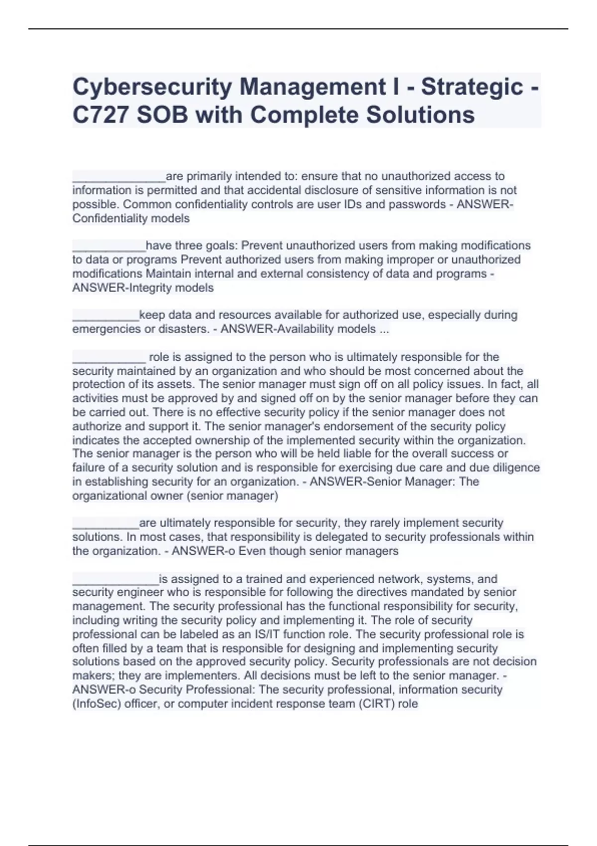 Cybersecurity Management I - Strategic - C727 SOB with Complete SolutionsCybersecurity Management I - Strategic - C727 SOB with Complete SolutionsCybersecurity Management I - Strategic - C727 SOB with Complete Solutions______________are primarily intended to: ensure that no unauthorized access to information is permitted and that accidental disclosure of sensitive information is not possible. Common confidentiality controls are user IDs and passwords - ANSWER-Confidentiality models ___________have three goals: Prevent unauthorized users from making modifications to data or programs Prevent authorized users from making improper or unauthorized modifications Maintain internal and external consistency of data and programs - ANSWER-Integrity models __________keep data and resources available for authorized use, especially during emergencies or disasters. - ANSWER-Availability models ... ___________ role is assigned to the person who is ultimately responsible for the security maintained by an organization and who should be most concerned about the protection of its assets. The senior manager must sign off on all policy issues. In fact, all activities must be approved by and signed off on by the senior manager before they can be carried out. There is no effective security policy if the senior manager does not authorize and support it. The senior manager's endorsement of the security policy indicates the accepted ownership of the implemented security within the organization. The senior manager is the person who will be held liable for the overall success or failure of a security solution and is responsible for exercising due care and due diligence in establishing security for an organization. - ANSWER-Senior Manager: The organizational owner (senior manager) __________are ultimately responsible for security, they rarely implement security solutions. In most cases, that responsibility is delegated to security professionals within the organization. - ANSWER-o Even though senior managers _____________is assigned to a trained and experienced network, systems, and