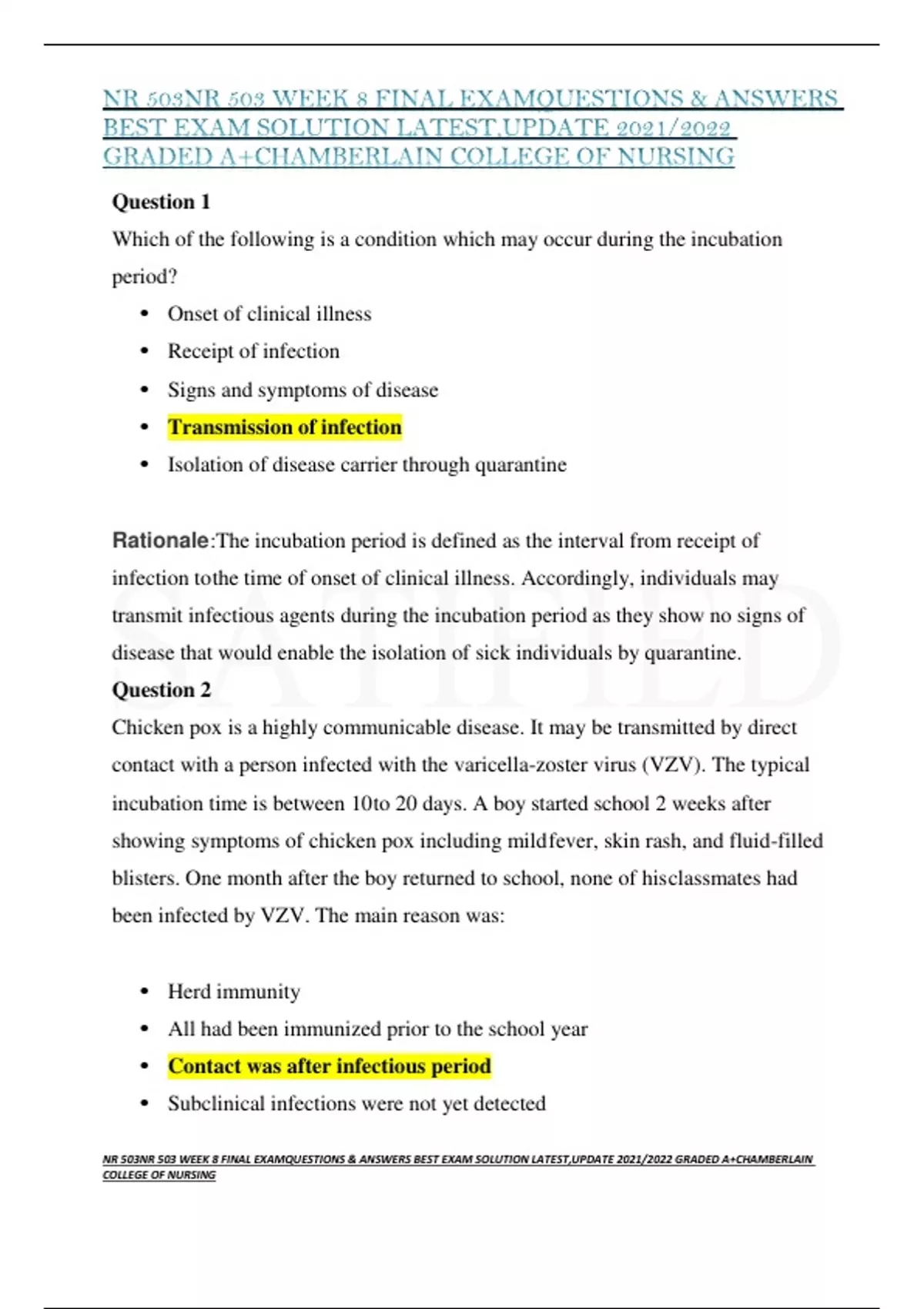 Question 1 Which of the following is a condition which may occur during the incubation period? • Onset of clinical illness • Receipt of infection • Signs and symptoms of disease • Transmission of infection • Isolation of disease carrier through quarantine Rationale :The incubation period is defined as the interval from receipt of infection to the time of onset of clinical illness. Accordingly, individuals may transmit infectious agents during the incubation period as they show no signs of disease that would enable the isolation of sick individuals by quarantine. Question 2 Chicken pox is a highly communicable disease. It may be transmitted by direct contact with a person infected with the varicella-zoster virus (VZV). The typical incubation time is between 10 to 20 days. A boy started school 2 weeks after showing symptoms of chicken pox including mild fever, skin rash, and fluid-filled blisters. One month after the boy returned to school, none of his classmates had been infected by VZV. The main reason was: • Herd immunity • All had been immunized prior to the school year • Contact was after infectious period • Subclinical infections were not yet detected NR 503NR 503 WEEK 8 FINAL EXAMQUESTIONS & ANSWERS BEST EXAM SOLUTION LATEST,UPDATE 2021/2022 GRADED A+CHAMBERLAIN COLLEGE OF NURSING • Disease was endemic in the class The disease is spread by contact with an infected individual who can transmit the agent (VZV) to immunologically naive persons during the incubation period and for several days after onset of clinical illness. Since the boy started school 14 days after showing signs consistent with chicken pox, it is most likely that he was no longer infectious.