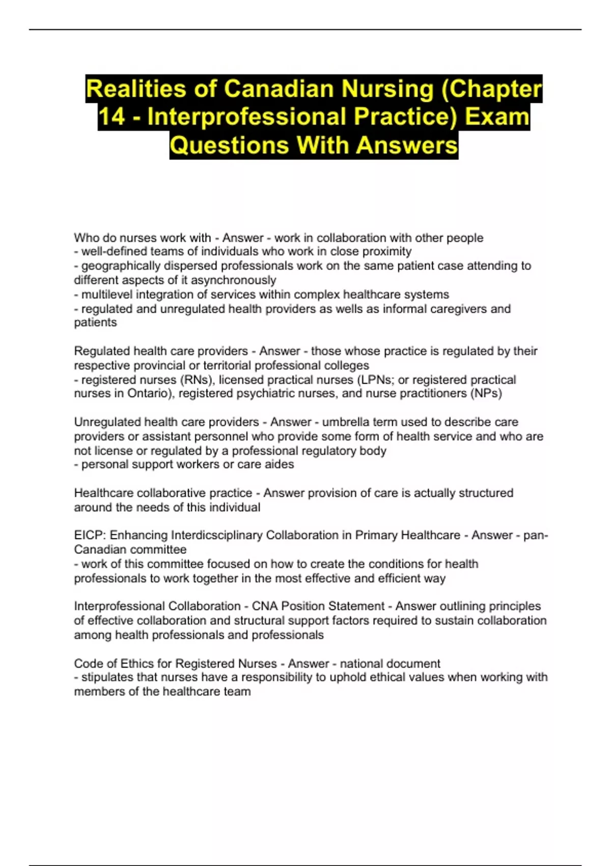 Realities of Canadian Nursing (Chapter 14 - Interprofessional Practice) Exam Questions With Answers...