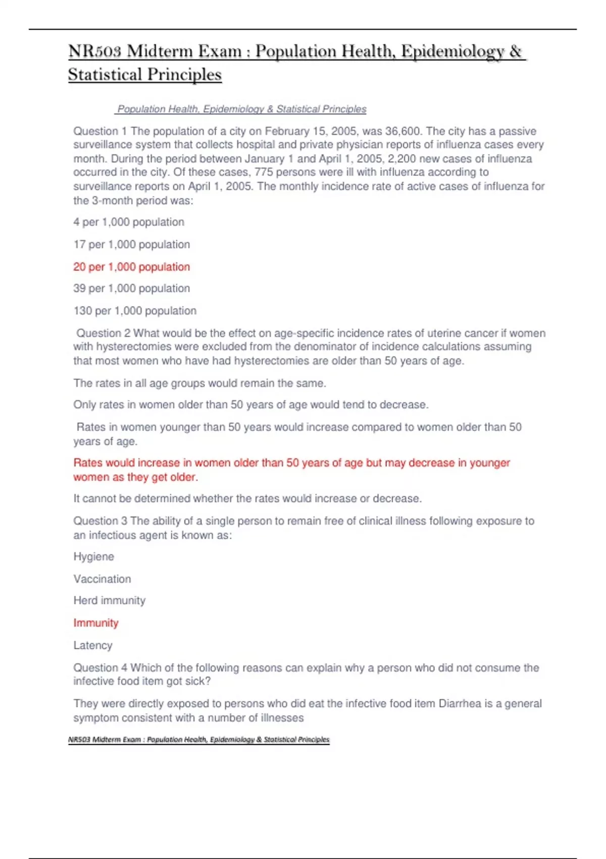 Question 1 The population of a city on February 15, 2005, was 36,600. The city has a passive surveillance system that collects hospital and private physician reports of influenza cases every month. During the period between January 1 and April 1, 2005, 2,200 new cases of influenza occurred in the city. Of these cases, 775 persons were ill with influenza according to surveillance reports on April 1, 2005. The monthly incidence rate of active cases of influenza for the 3-month period was: 4 per 1,000 population 17 per 1,000 population 20 per 1,000 population 39 per 1,000 population 130 per 1,000 population Question 2 What would be the effect on age-specific incidence rates of uterine cancer if women with hysterectomies were excluded from the denominator of incidence calculations assuming that most women who have had hysterectomies are older than 50 years of age. The rates in all age groups would remain the same. Only rates in women older than 50 years of age would tend to decrease. Rates in women younger than 50 years would increase compared to women older than 50 years of age. Rates would increase in women older than 50 years of age but may decrease in younger women as they get older. It cannot be determined whether the rates would increase or decrease. Question 3 The ability of a single person to remain free of clinical illness following exposure to an infectious agent is known as: Hygiene Vaccination Herd immunity Immunity Latency Question 4 Which of the following reasons can explain why a person who did not consume the infective food item got sick? They were directly exposed to persons who did eat the infective food item Diarrhea is a general symptom consistent with a number of illnesses NR503 Midterm Exam : Population Health, Epidemiology & Statistical Principles NR503 Midterm Exam : Population Health, Epidemiology & Statistical Principles There may have been an inaccurate recall of which foods were eaten NR503 Midterm Exam : Population Health, Epidemiology & Statistical Principles NR503 Midterm Exam : Population Health, Epidemiology & Statistical Principles All of the above None of the above Question 5 Which of the food items (or combination of items) is most likely to be the infective item(s)? Pizza only Ice cream only Neither pizza nor ice cream Both pizza and ice cream Cannot be assumed from the data shown Question 6 The table below describes the number of illnesses and deaths caused by plague in four communities. The case-fatality rate associated with plague is lowest in which community? Community A Community B Community C Community D