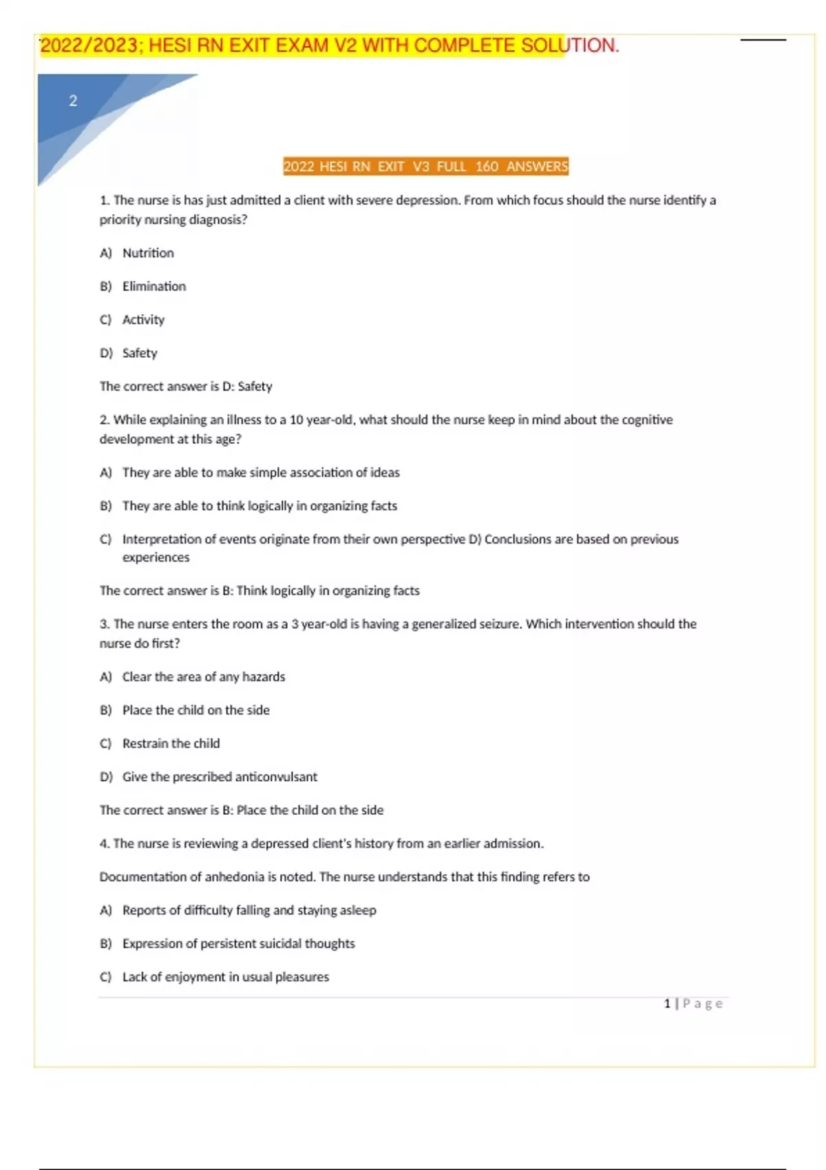 HESI RN EXIT EXAM V2 WITH COMPLETE SOLUTION 2023/2024