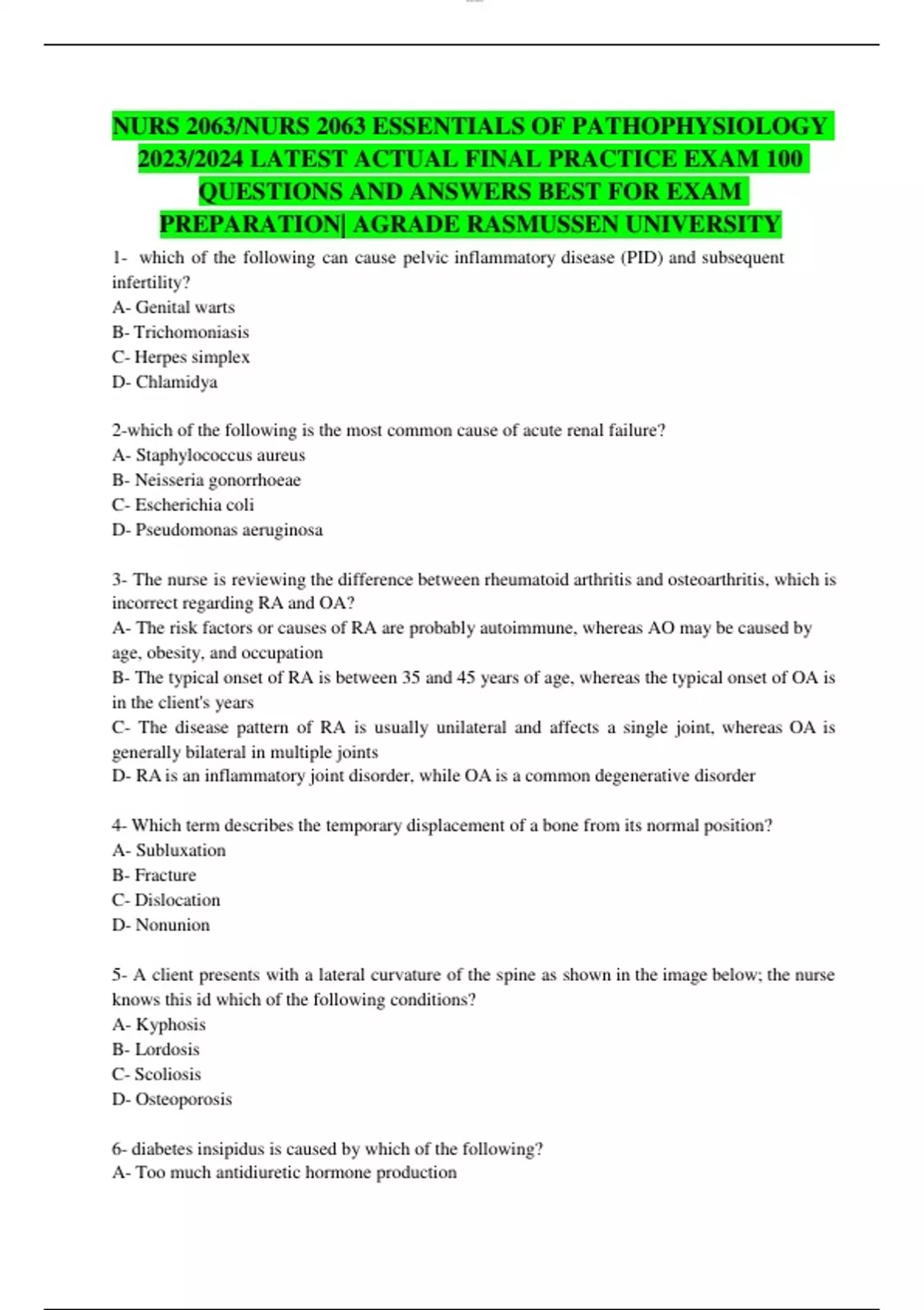 NURS 2063/NURS 2063 ESSENTIALS OF PATHOPHYSIOLOGY 2023/2024 LATEST REAL FINAL EXAM TEST BANK 226 QUESTIONS AND CORRECT ANSWERS ALREADY GRADED A+ RASMUSSEN UNIVERSITY