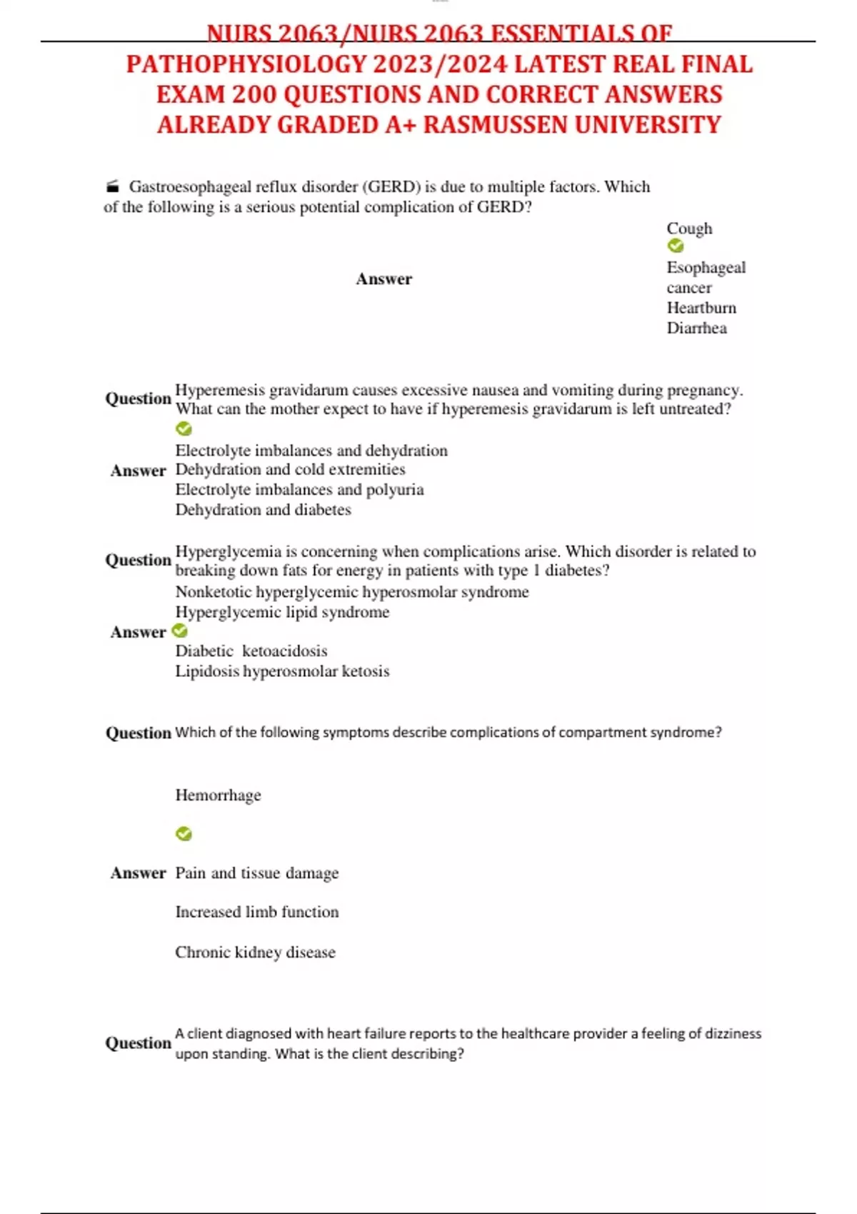 NURS 2063/NURS 2063 ESSENTIALS OF PATHOPHYSIOLOGY 2023/2024 LATEST REAL FINAL EXAM 200 QUESTIONS AND CORRECT ANSWERS ALREADY GRADED A+ RASMUSSEN UNIVERSITY