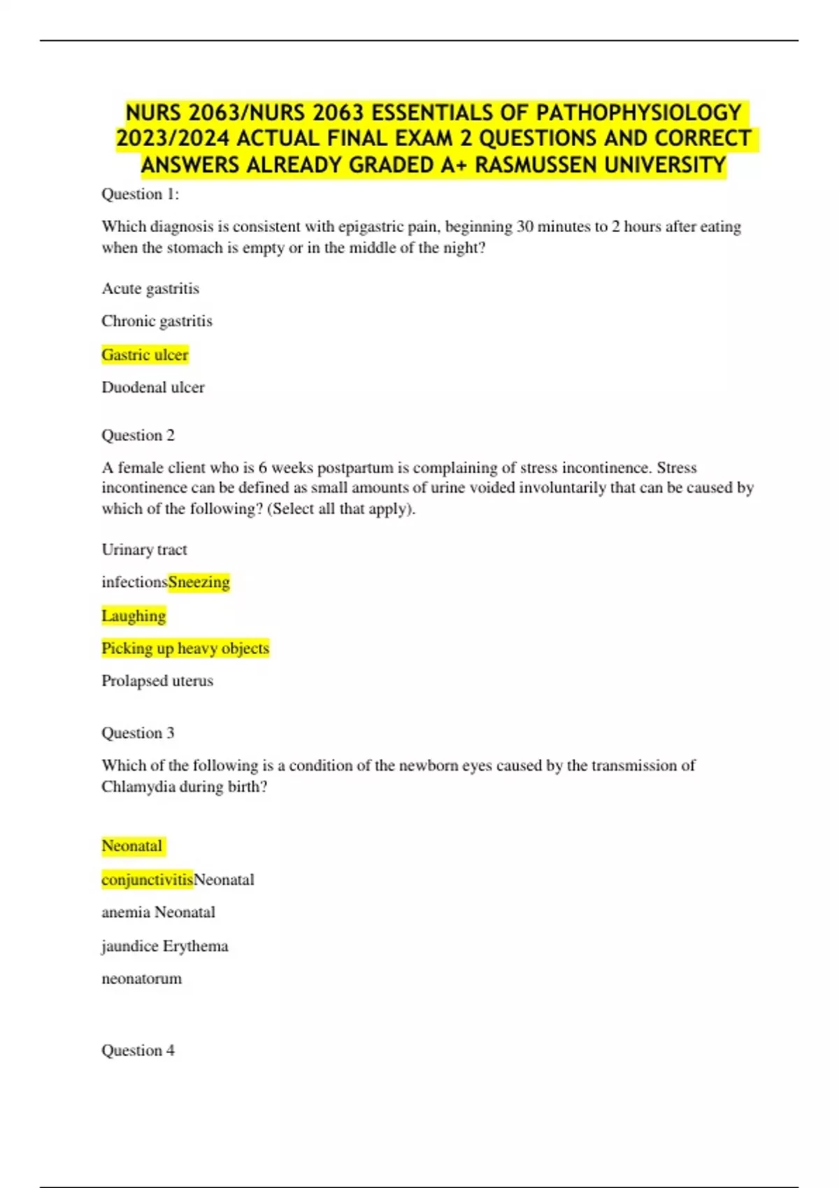 NURS 2063/NURS 2063 ESSENTIALS OF PATHOPHYSIOLOGY 2023/2024 ACTUAL FINAL EXAM 2 QUESTIONS AND CORRECT ANSWERS ALREADY GRADED A+ RASMUSSEN UNIVERSITY