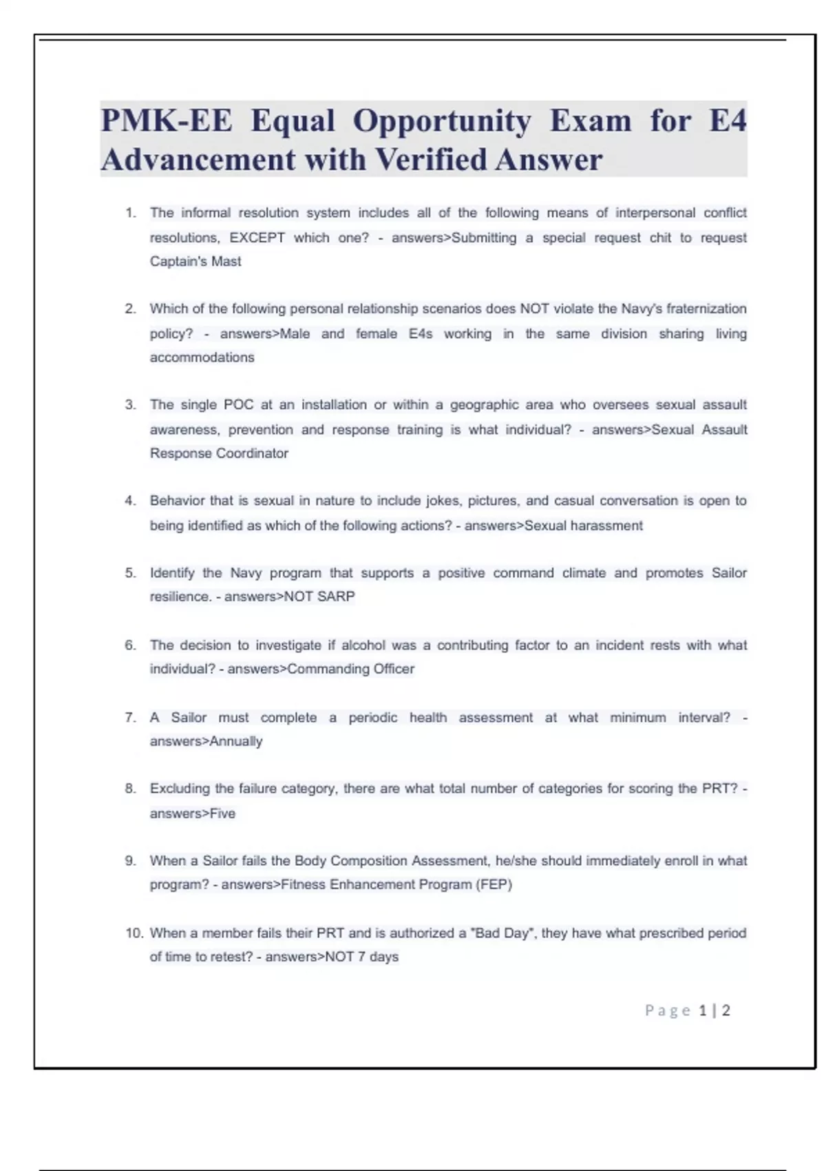PMK-EE Equal Opportunity Exam for E4 Advancement with Verified Answer PMK-EE Equal Opportunity Exam for E4 Advancement with Verified Answer