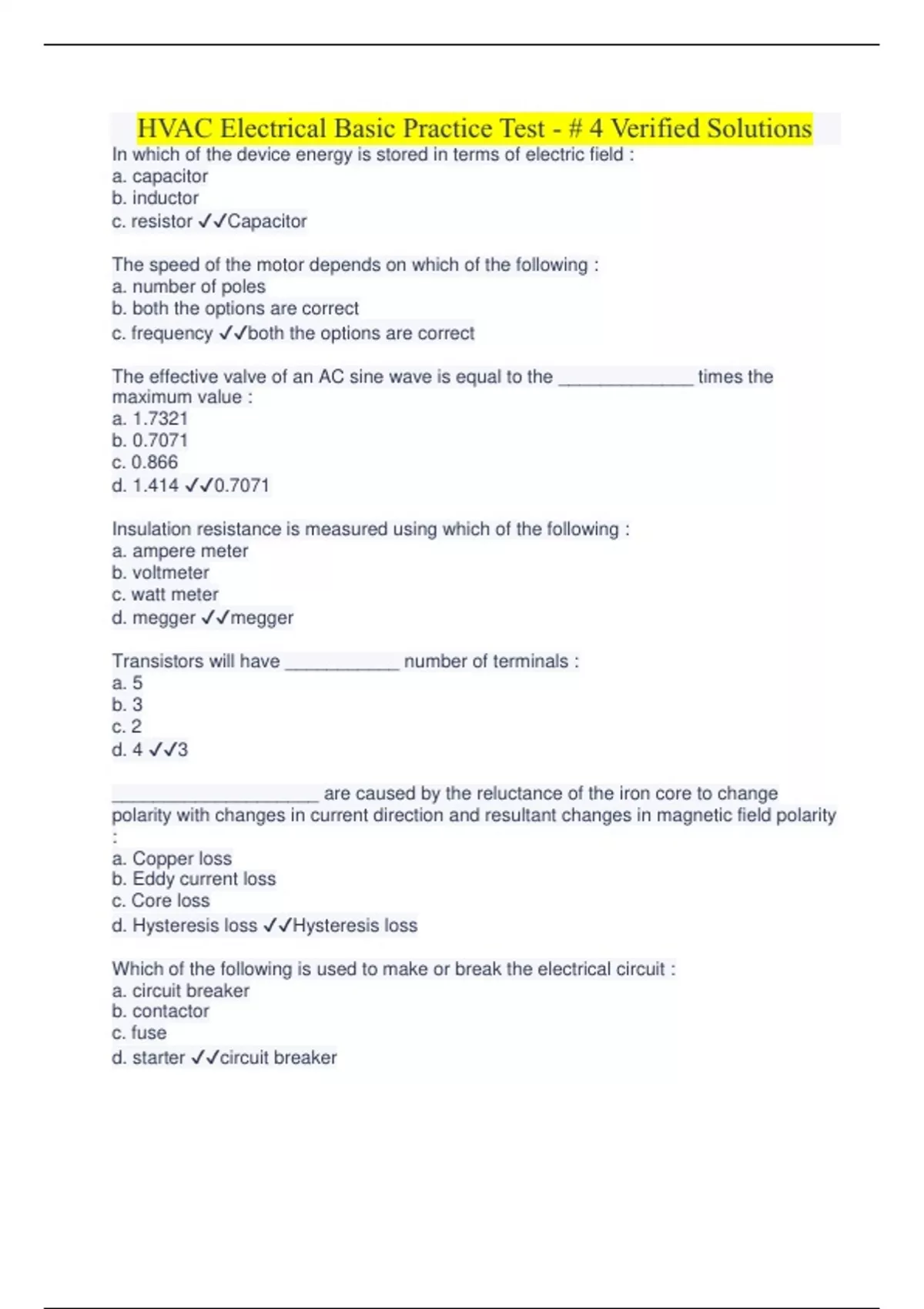HVAC Electrical Basic Practice Test - # 4 Verified Solutions HVAC Electrical Basic Practice Test - # 4 Verified Solutions HVAC Electrical Basic Practice Test - # 4 Verified Solutions