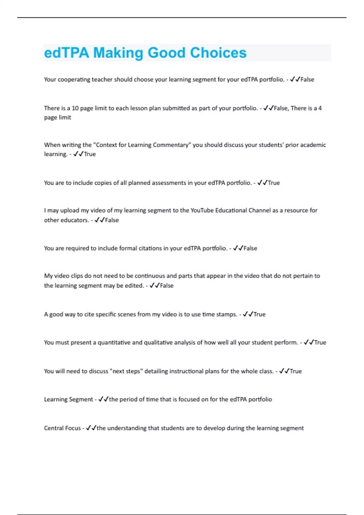 Your cooperating teacher should choose your learning segment for your edTPA portfolio. - False There is a 10 page limit to each lesson plan submitted as part of your portfolio. - False, There is a 4 page limit When writing the "Context for Learning Commentary" you should discuss your students' prior academic learning. - True You are to include copies of all planned assessments in your edTPA portfolio. - True I may upload my video of my learning segment to the YouTube Educational Channel as a resource for other educators. - False You are required to include formal citations in your edTPA portfolio. - False My video clips do not need to be continuous and parts that appear in the video that do not pertain to the learning segment may be edited. - False A good way to cite specific scenes from my video is to use time stamps. - True You must present a quantitative and qualitative analysis of how well all your student perform. - True You will need to discuss "next steps" detailing instructional plans for the whole class. - True Learning Segment - the period of time that is focused on for the edTPA portfolio Central Focus - the understanding that students are to develop during the learning segment