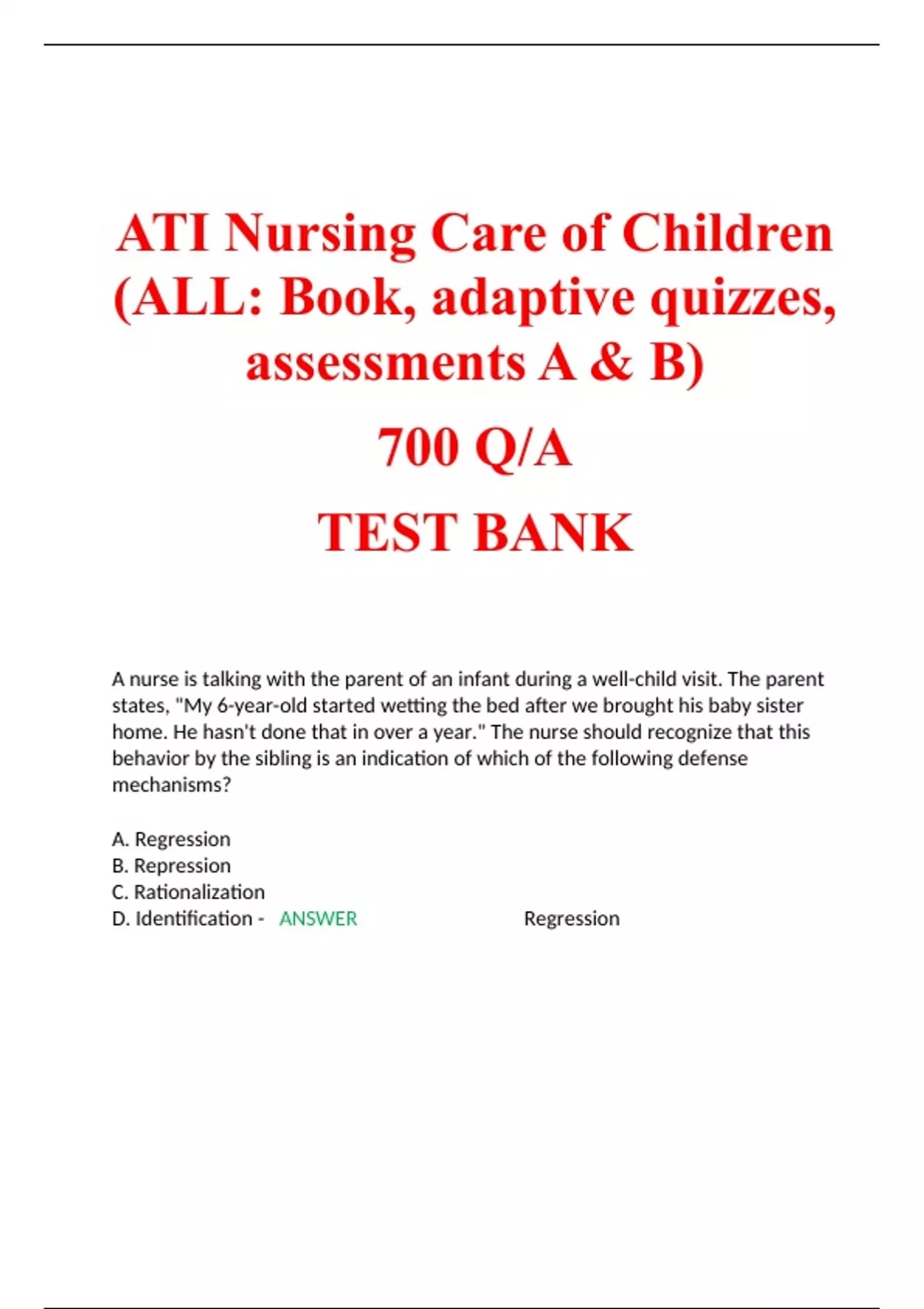 ATI Nursing Care of Children (ALL: Book, adaptive quizzes, assessments A & B) 700 Q/A TEST BANK