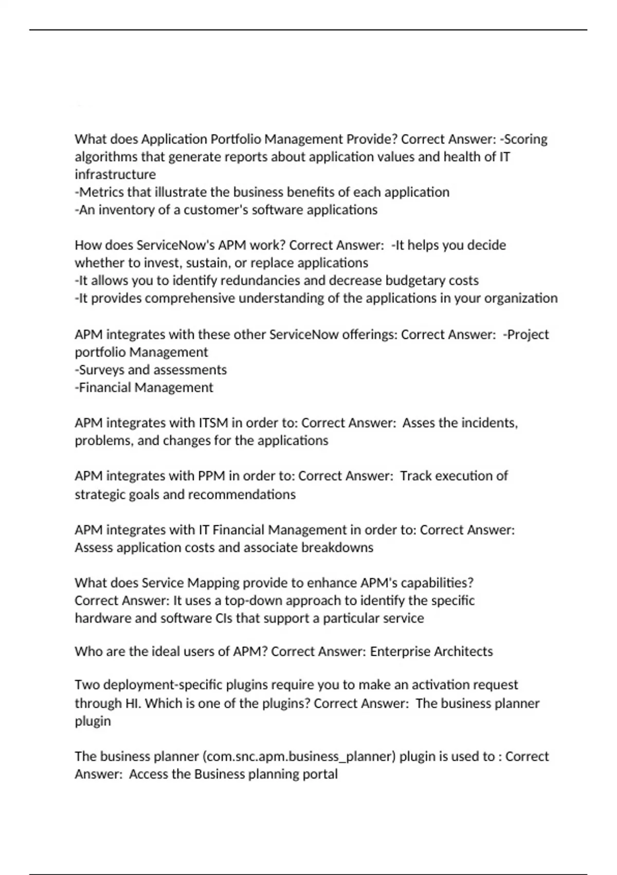 APM Service Now What does Application Portfolio Management Provide? Correct Answer: -Scoring algorithms that generate reports about application values and health of IT infrastructure -Metrics that illustrate the business benefits of each application -An inventory of a customer's software applications How does ServiceNow's APM work? Correct Answer: -It helps you decide whether to invest, sustain, or replace applications -It allows you to identify redundancies and decrease budgetary costs -It provides comprehensive understanding of the applications in your organization APM integrates with these other ServiceNow offerings: Correct Answer: -Project portfolio Management -Surveys and assessments -Financial Management