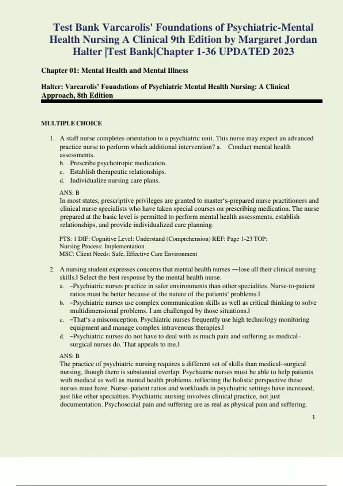 , Test Bank Varcarolis' Foundations of Psychiatric-Mental