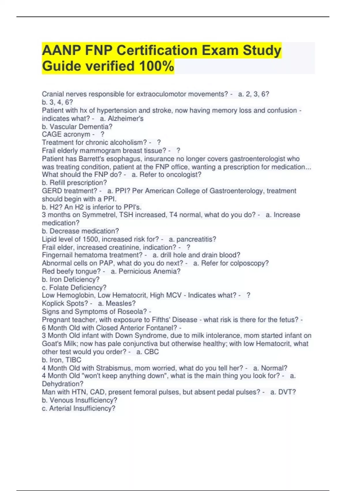 AANP FNP Certification Exam Study Guide verified 100% Cranial nerves responsible for extraoculomotor movements? - a. 2, 3, 6? b. 3, 4, 6? Patient with hx of hypertension and stroke, now having memory loss and confusion - indicates what? - a. Alzheimer's b. Vascular Dementia? CAGE acronym - ? Treatment for chronic alcoholism? - ? Frail elderly mammogram breast tissue? - ? Patient has Barrett's esophagus, insurance no longer covers gastroenterologist who was treating condition, patient at the FNP office, wanting a prescription for medication... What should the FNP do? - a. Refer to oncologist? b. Refill prescription?