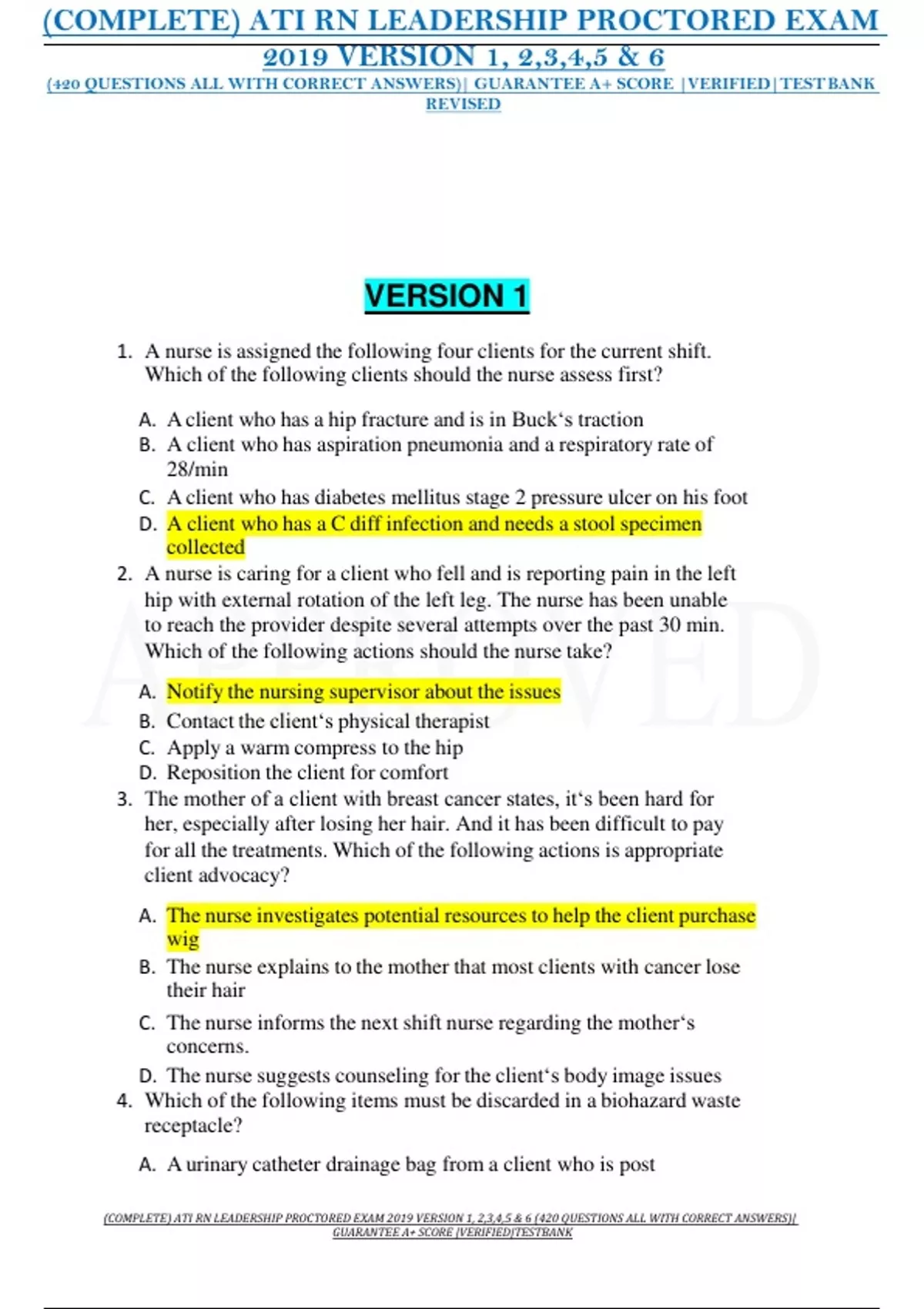 (COMPLETE) ATI RN LEADERSHIP PROCTORED EXAM 2019 VERSION 1, 2,3,4,5 & 6 (420 QUESTIONS ALL WITH CORRECT ANSWERS)| GUARANTEE A+ SCORE |VERIFIED|TEST BANK REVISED