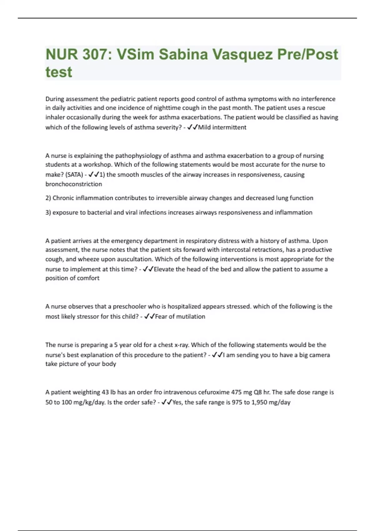 During assessment the pediatric patient reports good control of asthma symptoms with no interference in daily activities and one incidence of nighttime cough in the past month. The patient uses a rescue inhaler occasionally during the week for asthma exacerbations. The patient would be classified as having which of the following levels of asthma severity? - Mild intermittent A nurse is explaining the pathophysiology of asthma and asthma exacerbation to a group of nursing students at a workshop. Which of the following statements would be most accurate for the nurse to make? (SATA) - 1) the smooth muscles of the airway increases in responsiveness, causing bronchoconstriction 2) Chronic inflammation contributes to irreversible airway changes and decreased lung function 3) exposure to bacterial and viral infections increases airways responsiveness and inflammation A patient arrives at the emergency department in respiratory distress with a history of asthma. Upon assessment, the nurse notes that the patient sits forward with intercostal retractions, has a productive cough, and wheeze upon auscultation. Which of the following interventions is most appropriate for the nurse to implement at this time? - Elevate the head of the bed and allow the patient to assume a position of comfort A nurse observes that a preschooler who is hospitalized appears stressed. which of the following is the most likely stressor for this child? - Fear of mutilation The nurse is preparing a 5 year old for a chest x-ray. Which of the following statements would be the nurse's best explanation of this procedure to the patient? - I am sending you to have a big camera take picture of your body A patient weighting 43 lb has an order fro intravenous cefuroxime 475 mg Q8 hr. The safe dose range is 50 to 100 mg/kg/day. Is the order safe? - Yes, the safe range is 975 to 1,950 mg/day