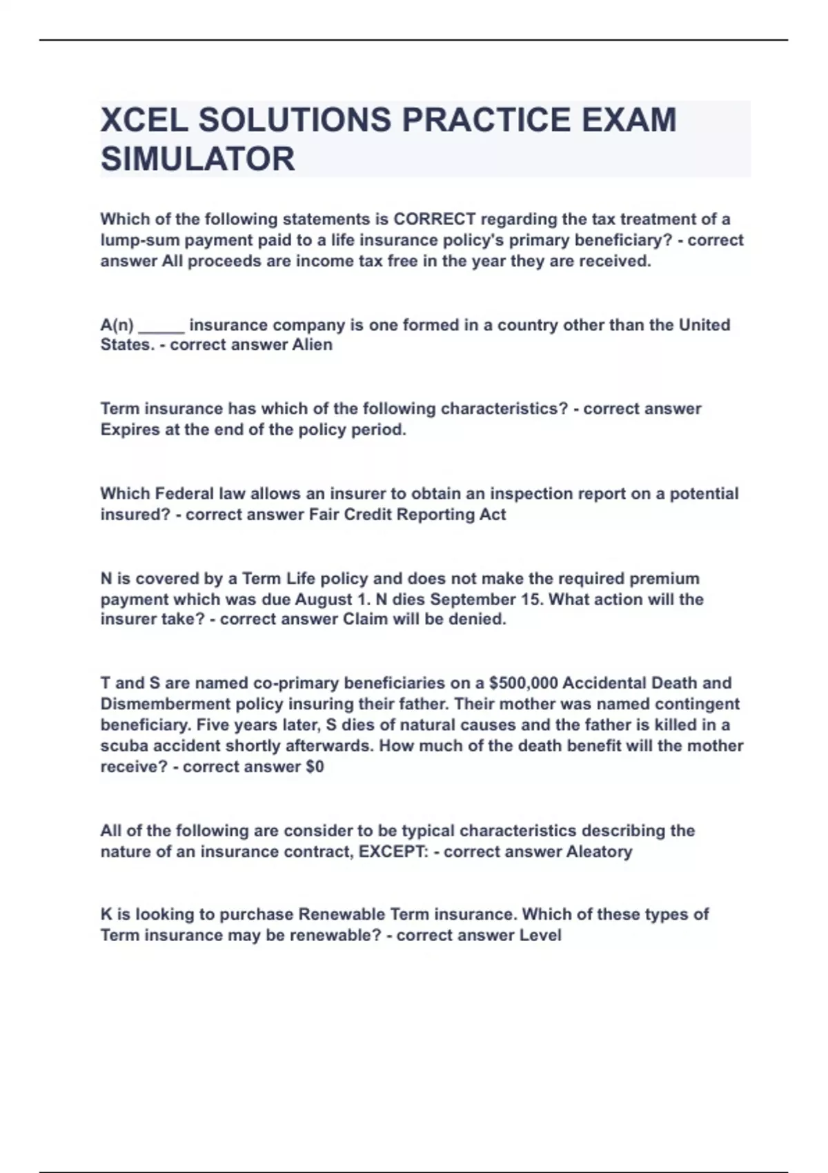 Which of the following statements is CORRECT regarding the tax treatment of a lump-sum payment paid to a life insurance policy's primary beneficiary? All proceeds are income tax free in the year they are received. A(n) _____ insurance company is one formed in a country other than the United States. Alien Term insurance has which of the following characteristics? Expires at the end of the policy period. Which Federal law allows an insurer to obtain an inspection report on a potential insured? Fair Credit Reporting Act N is covered by a Term Life policy and does not make the required premium payment which was due August 1. N dies September 15. What action will the insurer take? Claim will be denied. T and S are named co-primary beneficiaries on a $500,000 Accidental Death and Dismemberment policy insuring their father. Their mother was named contingent beneficiary. Five years later, S dies of natural causes and the father is killed in a scuba accident shortly afterwards. How much of the death benefit will the mother receive? $0 All of the following are consider to be typical characteristics describing the nature of an insurance contract, EXCEPT: Aleatory K is looking to purchase Renewable Term insurance. Which of these types of Term insurance may be renewable? Level A life insurance policy which ensures that the premium will be paid if the insured becomes disabled has what kind of rider attached? Waiver of Premium P is the insured on a participating life policy. Which statement is true if P's premiums are waived due to a disability? P will still receive declared dividends. A policy of adhesion can only be modified by whom? The insurance company An individual working part-time has an annual income of 25,000. If this individual has an IRA, what is the maximum deductible IRA contribution allowable? $2,500 How long does the coverage normally remain on a limited-pay life policy? Age 100 A foreign insurance company doing business in Indiana: Is a company that was formed under the laws of another state. All are true statements regarding the underwriting process, EXCEPT: AIDS and HIV virus exams can be conducted in a discriminatory fashion. Which settlement option pays a stated amount to an annuitant, but no residual value to a beneficiary? Life Income Which of the following types of policies pays a benefit if the insured goes blind? AD&D Rick recently died and left behind an individual IRA account in his name. His widow was forwarded the balance of the IRA. The widow qualifies for the Marital deduction The amount of monthly disability benefits payable under Social Security is affected by which of the following factors? Amount of the benefit available from other sources. An individual covered under a Group Life insurance policy is considered to be a(n): Certificate holder The Consideration cause in a life insurance contract contains what pertinent information? Amount of premium payments and when they are due. An insurance applicant MUST be informed of an investigation regarding his/her reputation and character according to the: Fair Credit Reporting Act