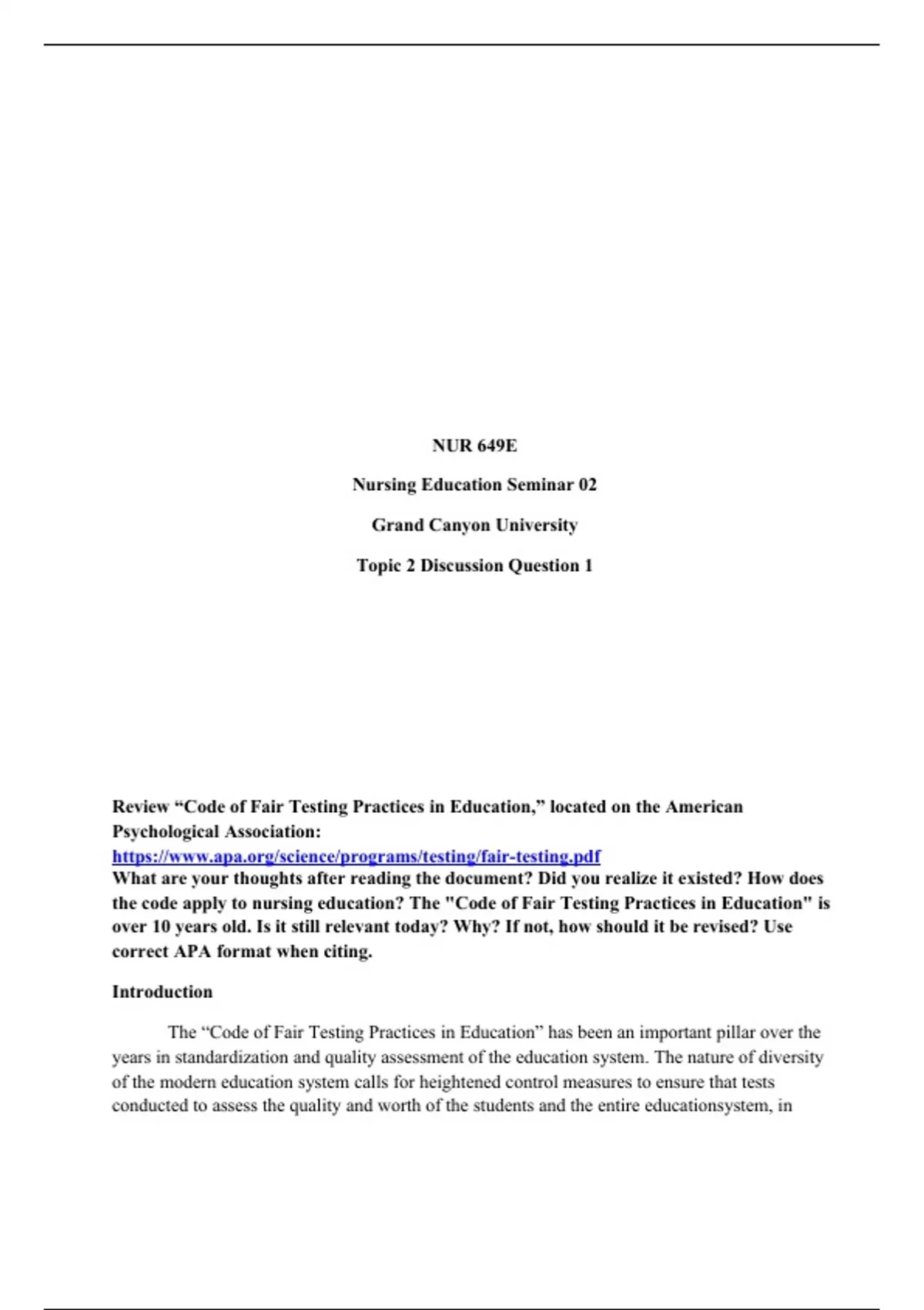 NUR 649E (Nursing Education Seminar 02) Topic 2 Discussion Question 1 Description: Review “Code of Fair Testing Practices in Education,” located on the American Psychological Association: What are your thoughts after reading the document? Did you realize it existed? How does the code apply to nursing education? The "Code of Fair Testing Practices in Education" is over 10 years old. Is it still relevant today? Why? If not, how should it be revised? Use correct APA format when citing.