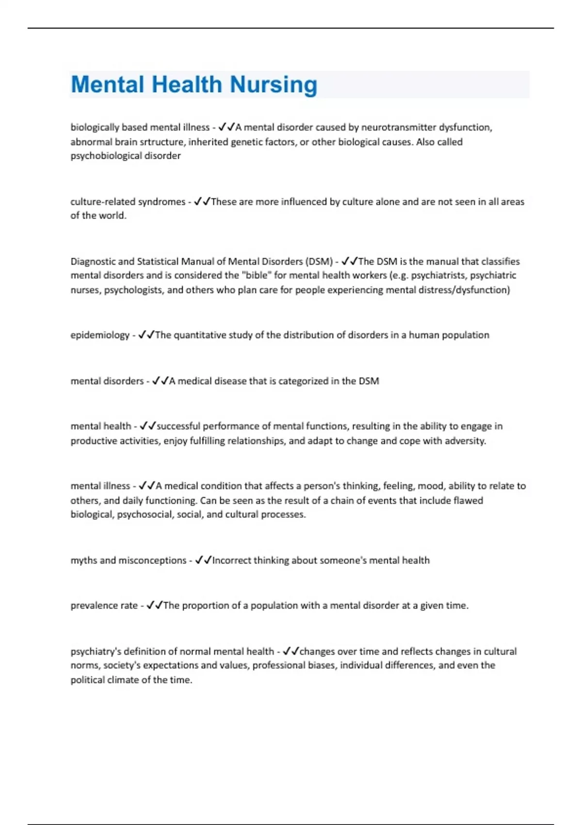 biologically based mental illness - A mental disorder caused by neurotransmitter dysfunction, abnormal brain srtructure, inherited genetic factors, or other biological causes. Also called psychobiological disorder culture-related syndromes - These are more influenced by culture alone and are not seen in all areas of the world. Diagnostic and Statistical Manual of Mental Disorders (DSM) - The DSM is the manual that classifies mental disorders and is considered the "bible" for mental health workers (e.g. psychiatrists, psychiatric nurses, psychologists, and others who plan care for people experiencing mental distress/dysfunction) epidemiology - The quantitative study of the distribution of disorders in a human population mental disorders - A medical disease that is categorized in the DSM mental health - successful performance of mental functions, resulting in the ability to engage in productive activities, enjoy fulfilling relationships, and adapt to change and cope with adversity. mental illness - A medical condition that affects a person's thinking, feeling, mood, ability to relate to others, and daily functioning. Can be seen as the result of a chain of events that include flawed biological, psychosocial, social, and cultural processes. myths and misconceptions - Incorrect thinking about someone's mental health prevalence rate - The proportion of a population with a mental disorder at a given time. psychiatry's definition of normal mental health - changes over time and reflects changes in cultural norms, society's expectations and values, professional biases, individual differences, and even the political climate of the obiological disorder - A mental disorder caused by neurotransmitter dysfunction, abnormal brain srtructure, inherited genetic factors, or other biological causes. Also called biologically based mental illness