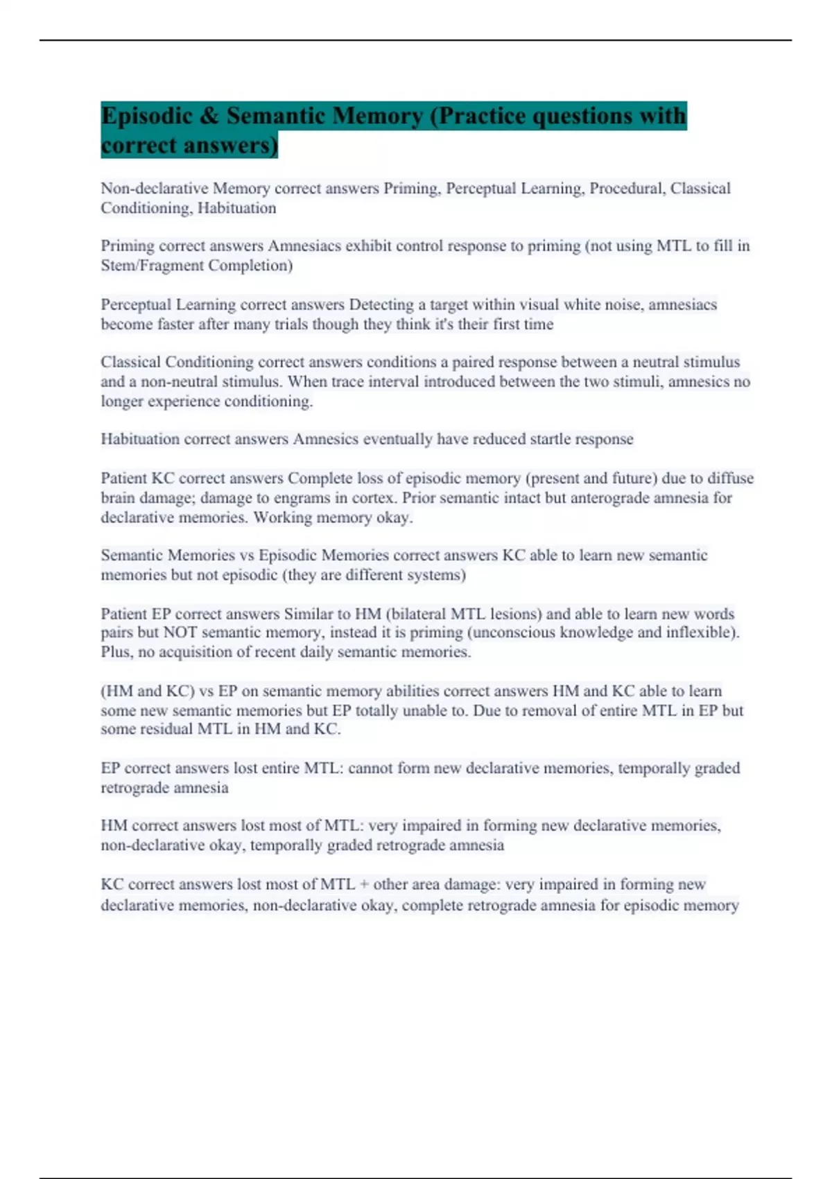 Episodic & Semantic Memory (Practice questions with correct answers)