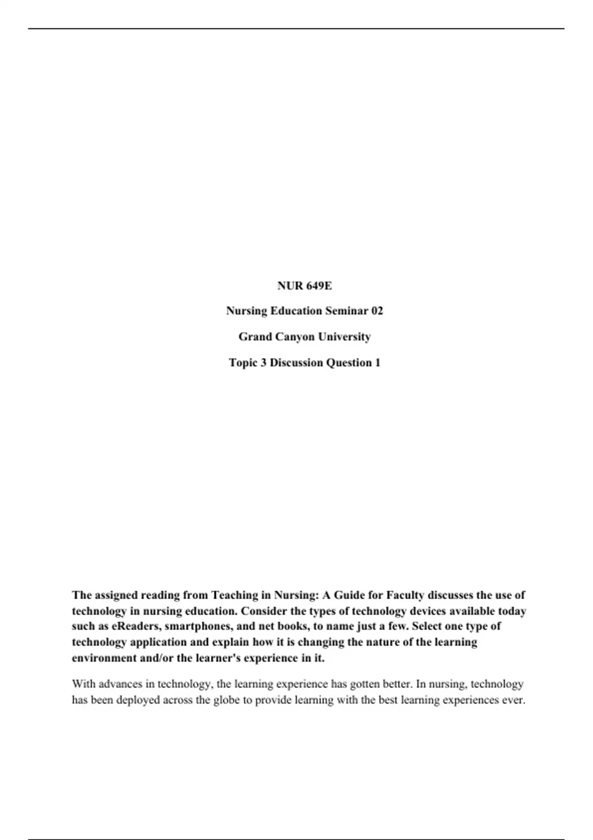 NUR 649E (Nursing Education Seminar 02) Topic 3 Discussion Question 1 Description: The assigned reading from Teaching in Nursing: A Guide for Faculty discusses the use of technology in nursing education. Consider the types of technology devices available today such as eReaders, smartphones, and netbooks, to name just a few. Select one type of technology application and explain how it is changing the nature of the learning environment and/or the learner's experience in it.