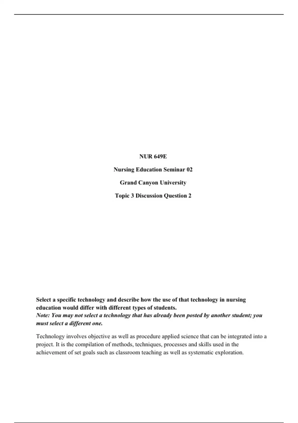 NUR 649E (Nursing Education Seminar 02) Topic 3 Discussion Question 2 Description: Select a specific technology and describe how the use of that technology in nursing education would differ with different types of students. Note: You may not select a technology that has already been posted by another student; you must select a different one.